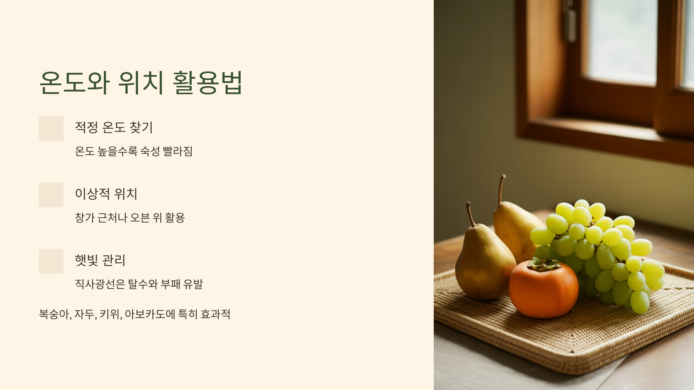 🍑 3. 따뜻한 곳에 두기 – 햇빛은 피하고, 실내 보관