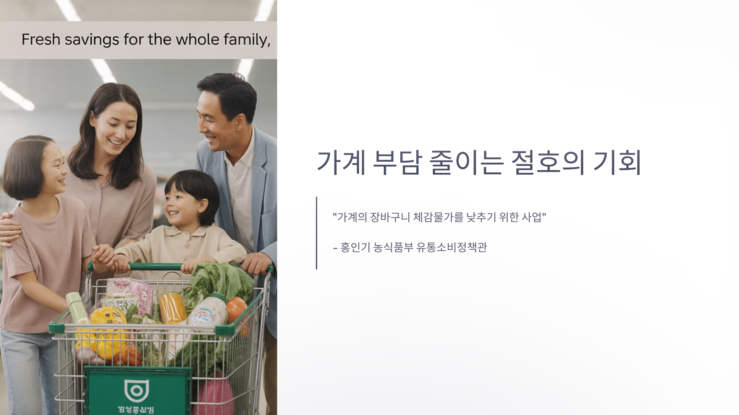 “방학과 휴가철을 맞아 가계의 식비가 증가할 것으로 예상돼 소비자들의 장바구니 체감물가를 낮추기 위해 이 사업을 추진하게 됐습니다. 앞으로도 농축산물 집중 소비 시기나 가격 상승 시에는 지속적으로 할인 지원 사업을 펼쳐 가계 부담을 덜어드리겠습니다.”
