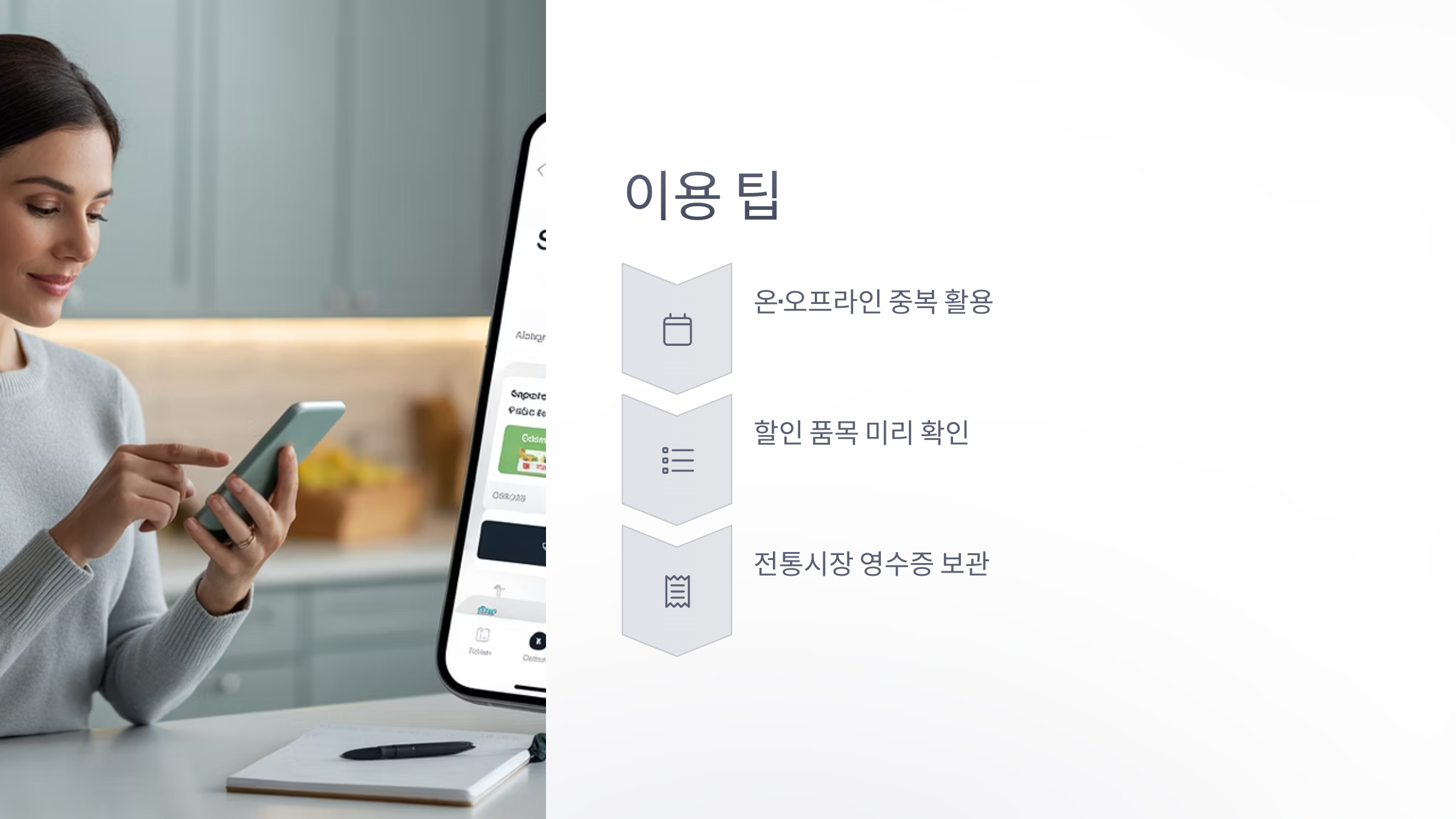 참여 유통업체의 앱이나 홈페이지에 방문하면 할인 대상 품목을 확인할 수 있습니다. 특히 제철 채소, 과일, 고기 부위별 리스트를 체크하세요. - 전통시장 영수증 꼭 보관