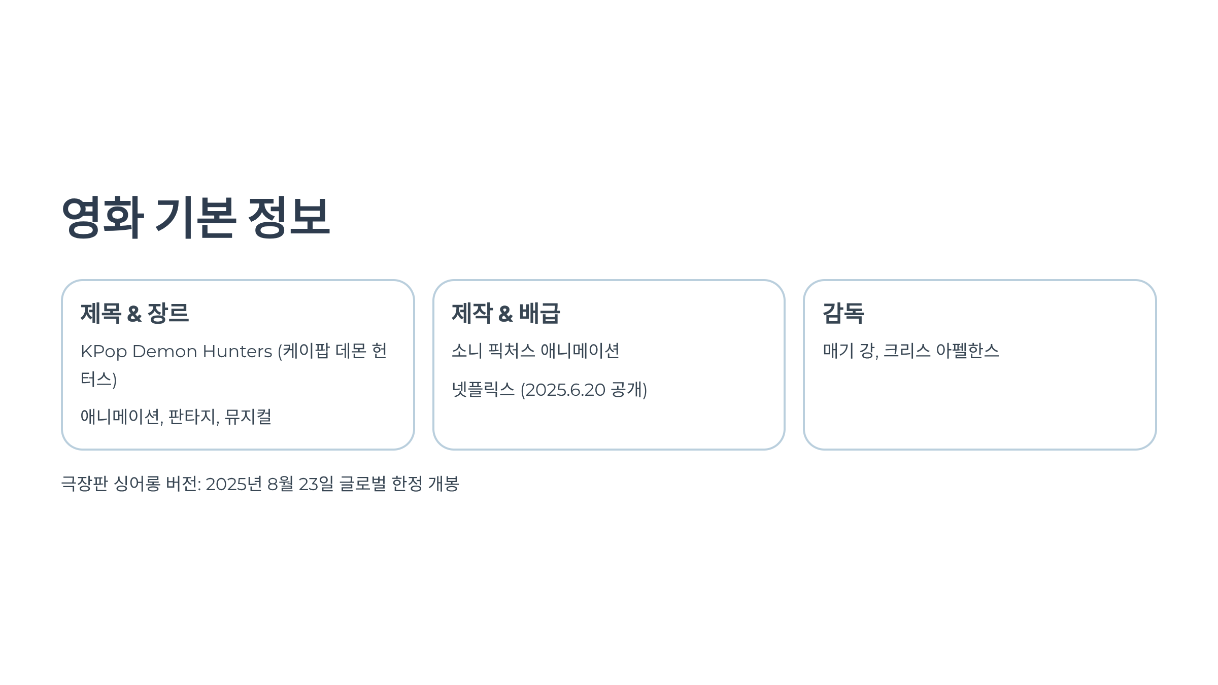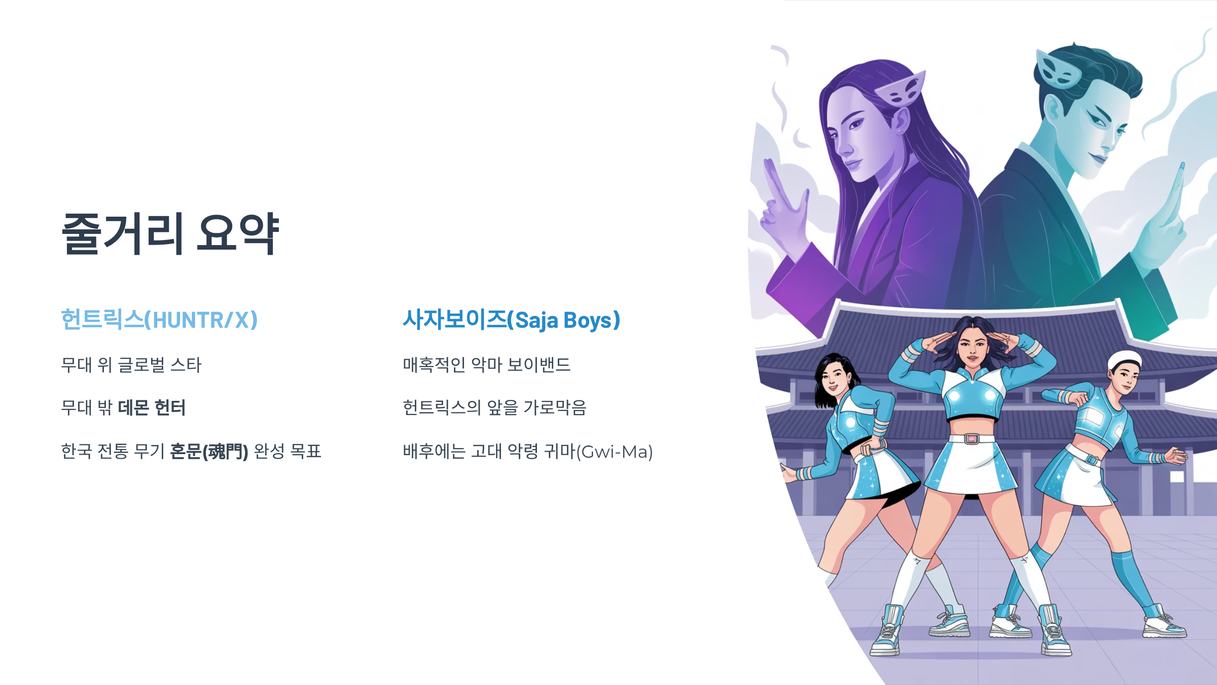 - 주요 키워드: 케이팝, 악마 헌터, 애니메이션, 걸그룹, 사자보이즈, 넷플릭스 영화