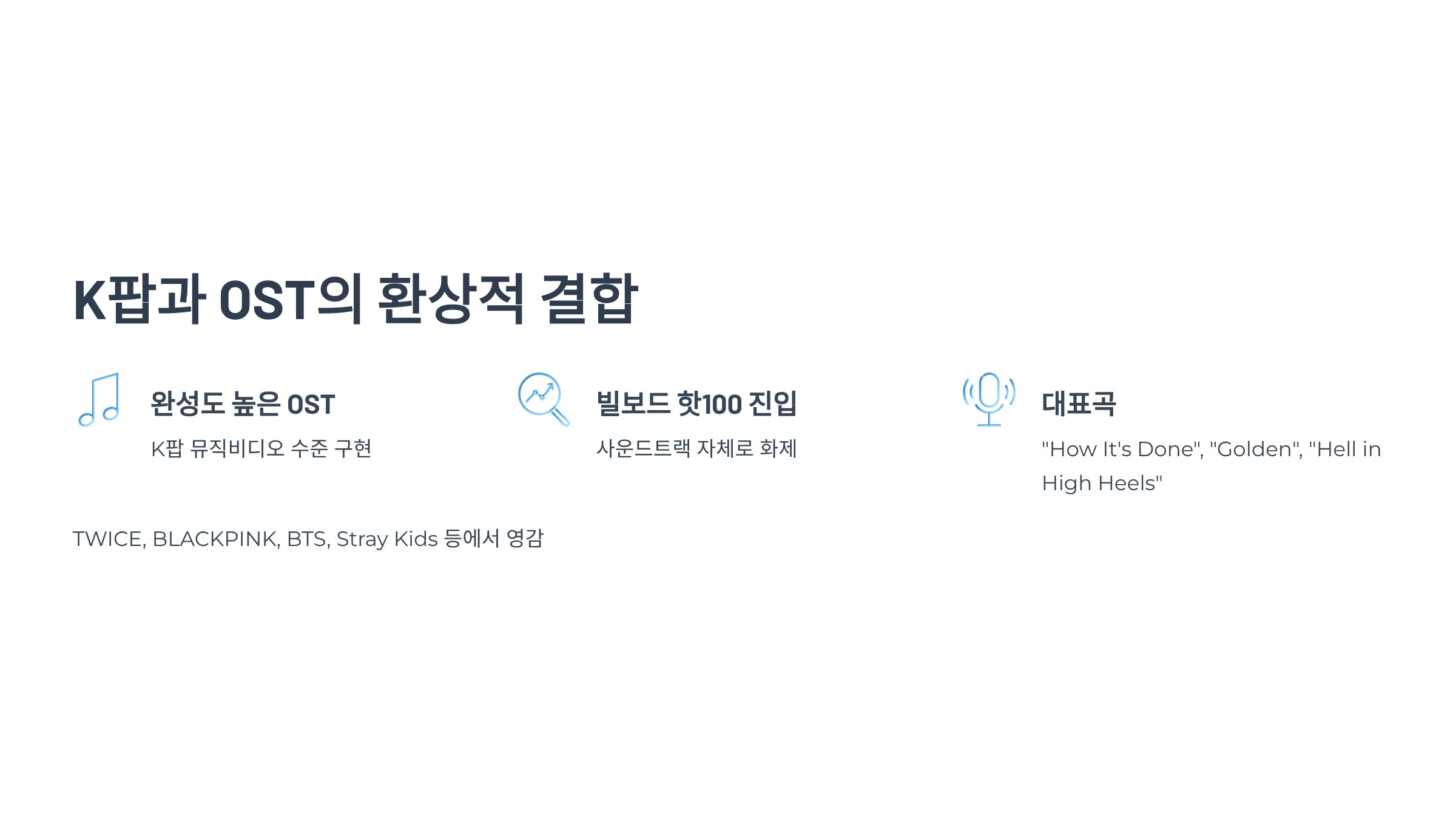 - 대표 OST: "How It’s Done", "Golden", "Hell in High Heels" 등