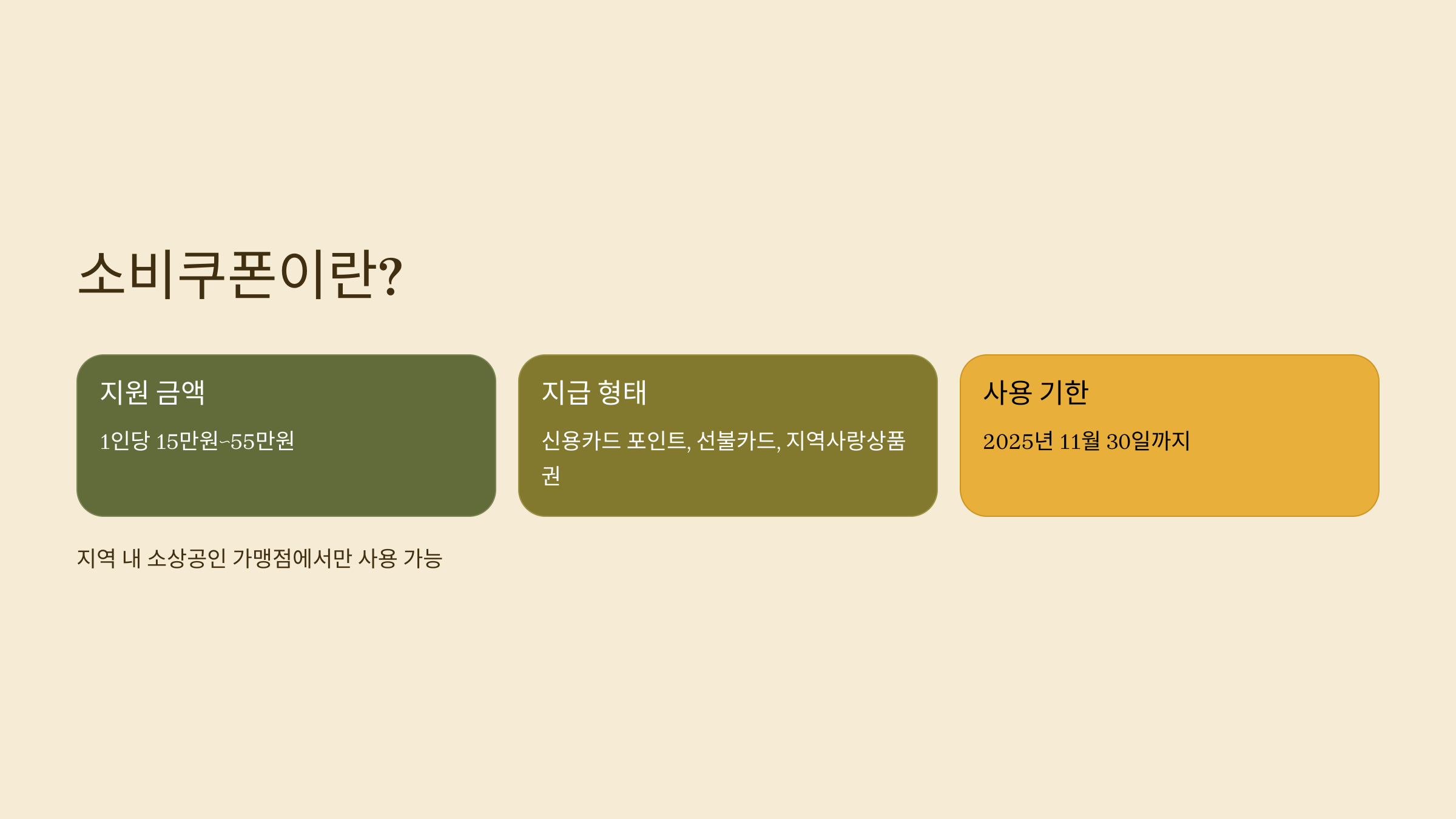 지원금은 1인당 15만 원부터 시작하며, 소득, 지역, 가구 상황에 따라 최대 55만 원까지 지급될 수 있습니다. 해당 금액은 11월 30일까지 지역 내 소상공인 가맹점에서만 사용 가능합니다.