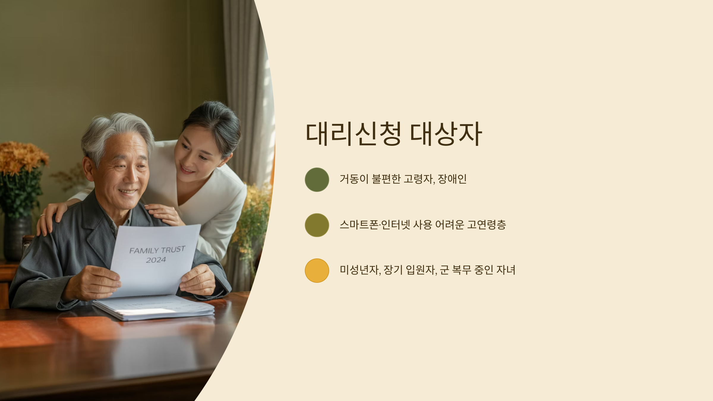 대리인은 대상자와의 관계를 증명할 수 있어야 하며, 반드시 지정 서류를 갖추고 신청해야 합니다.