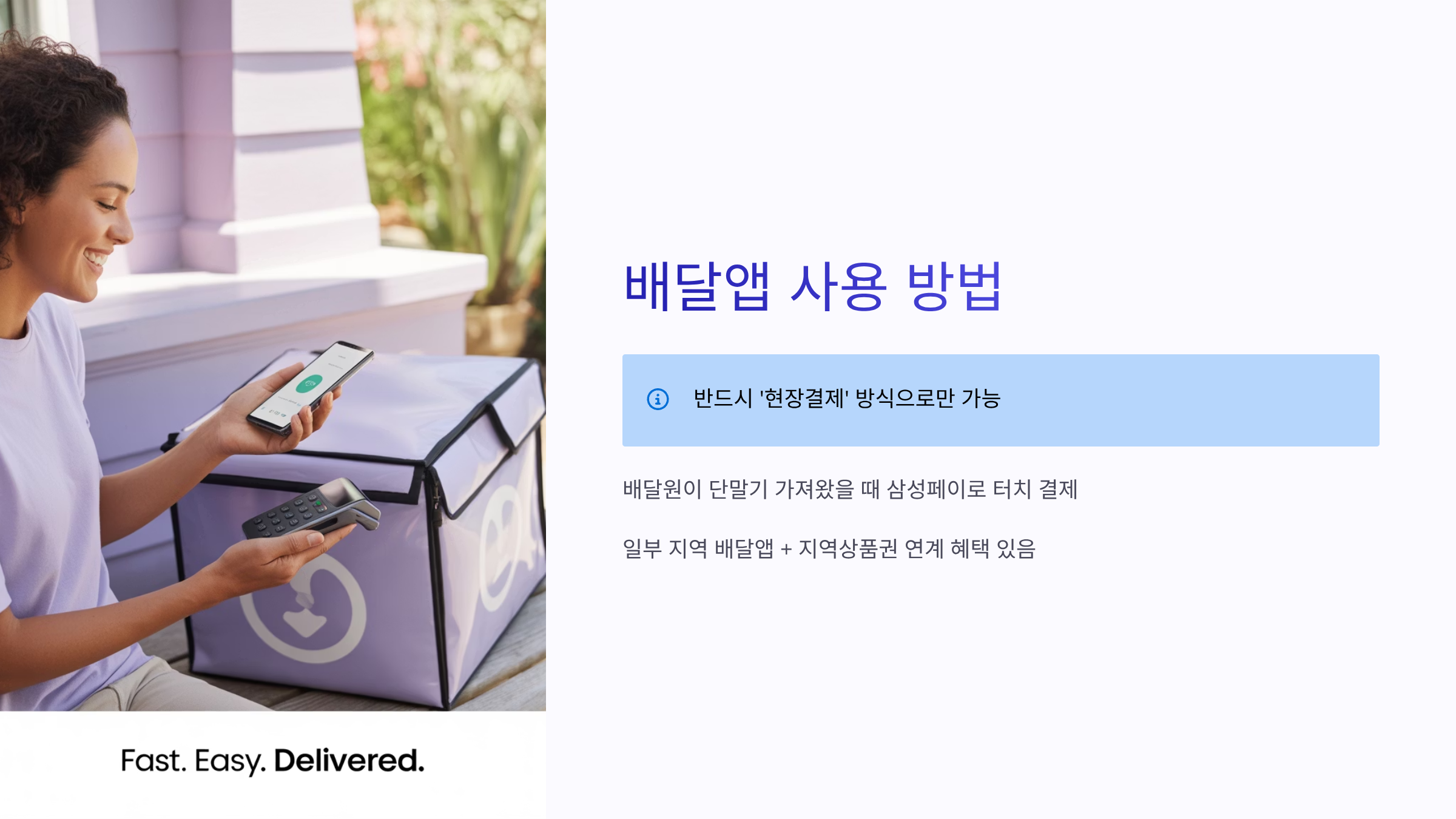 배달앱도 조건을 충족하면 삼성페이로 소비쿠폰을 사용할 수 있습니다. 단, 결제 방식은 반드시 '현장결제'여야 하며, 배달원이 단말기를 가져왔을 때 삼성페이로 터치 결제하는 형태로 진행됩니다.