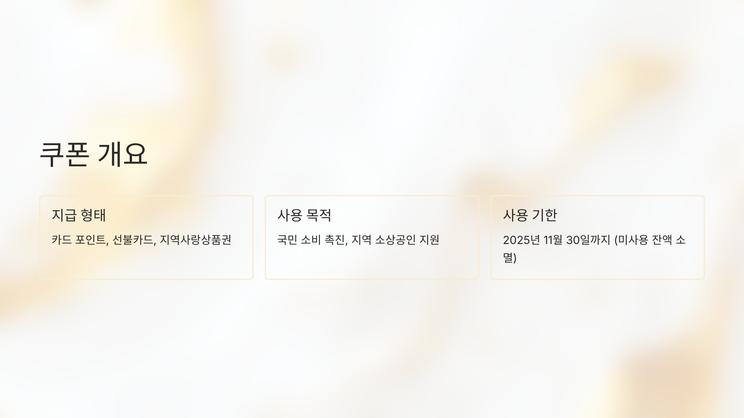 쿠폰은 1인당 15만~55만 원 상당의 카드 포인트, 선불카드, 또는 지역사랑상품권 형태로 지급되며, 11월 30일까지 사용해야 자동 소멸되지 않습니다.