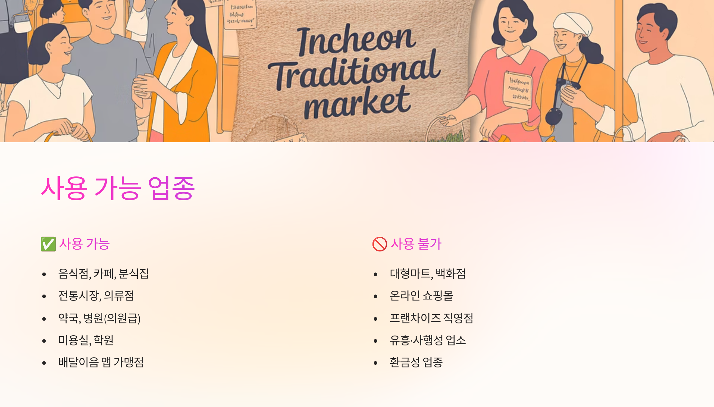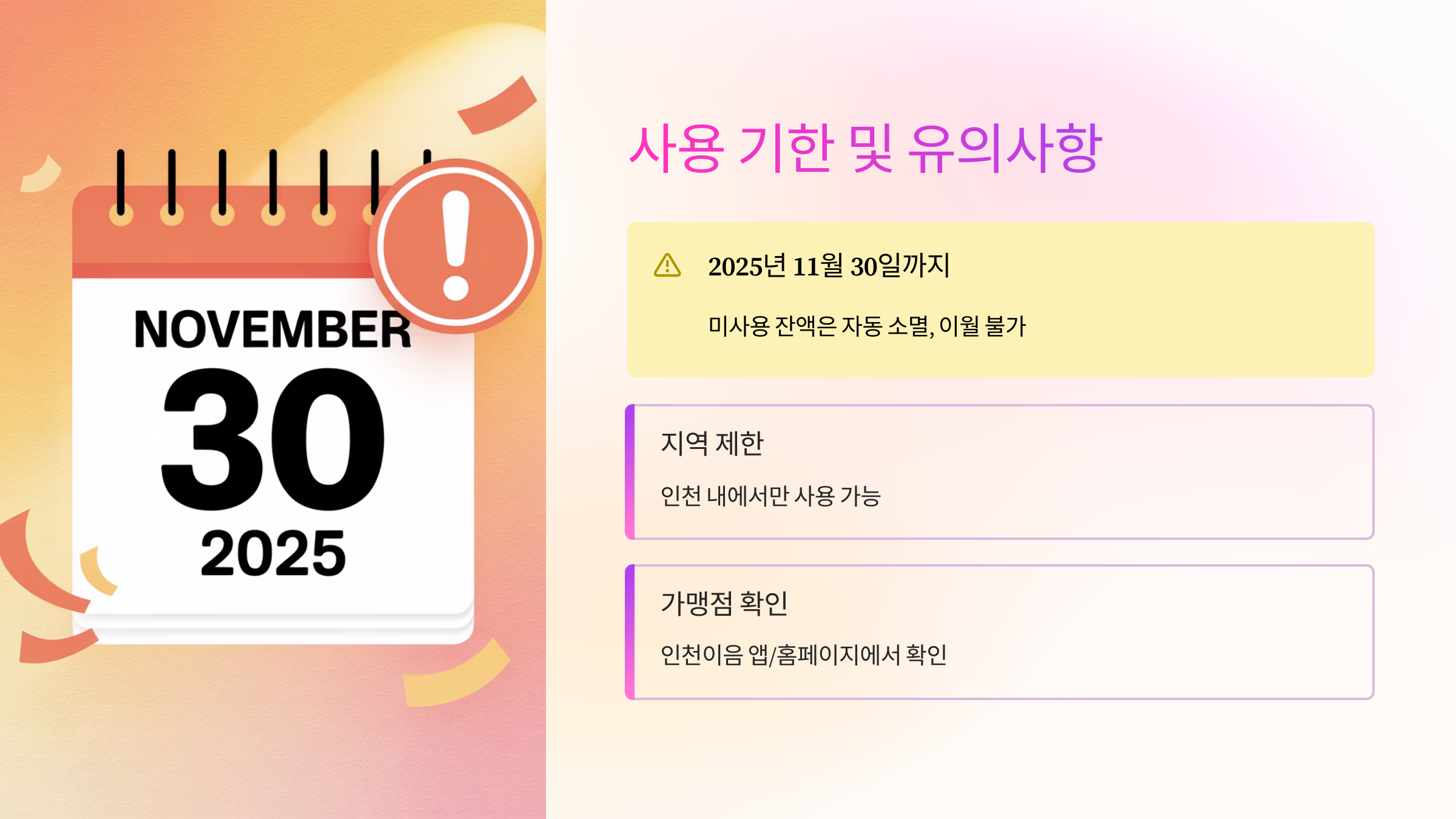 - 사용 가능 가맹점은 인천이음 앱 또는 홈페이지에서 확인 가능