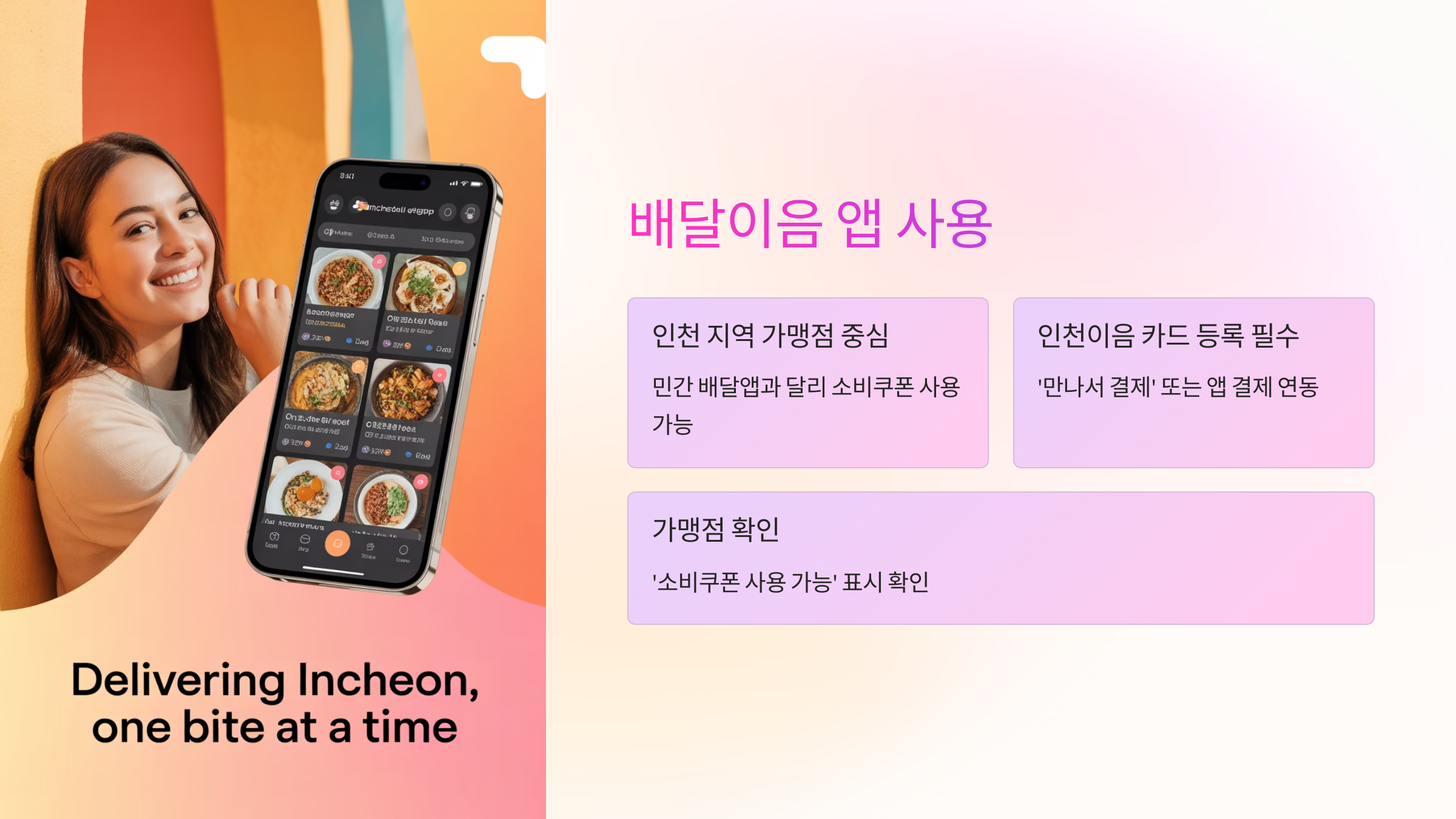 인천시가 운영하는 배달앱 ‘배달이음’은 소비쿠폰 사용이 가능한 플랫폼입니다.
