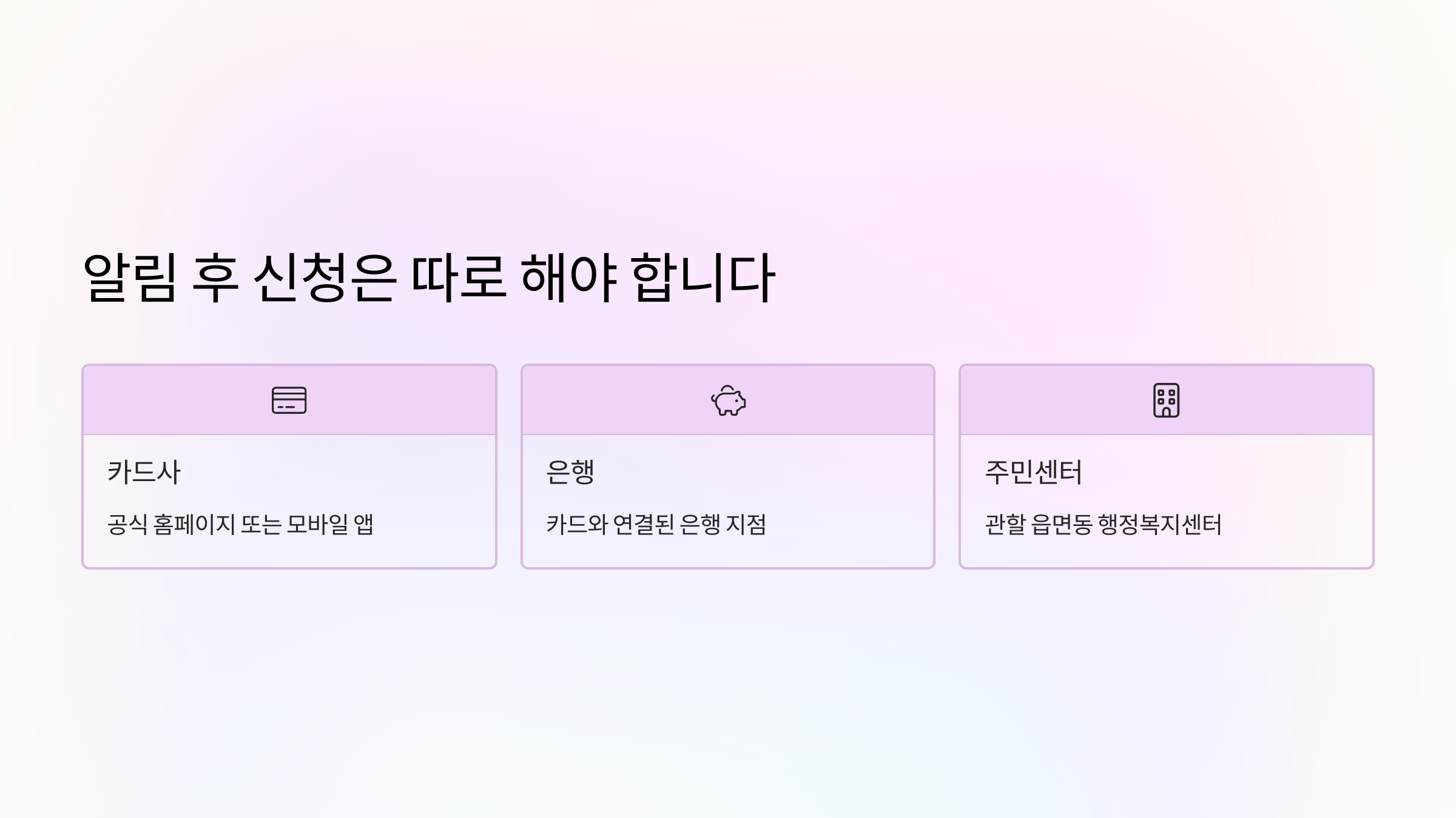 | 신청 방법 | 카드사 홈페이지, 앱, 은행, 주민센터 중 택1 |