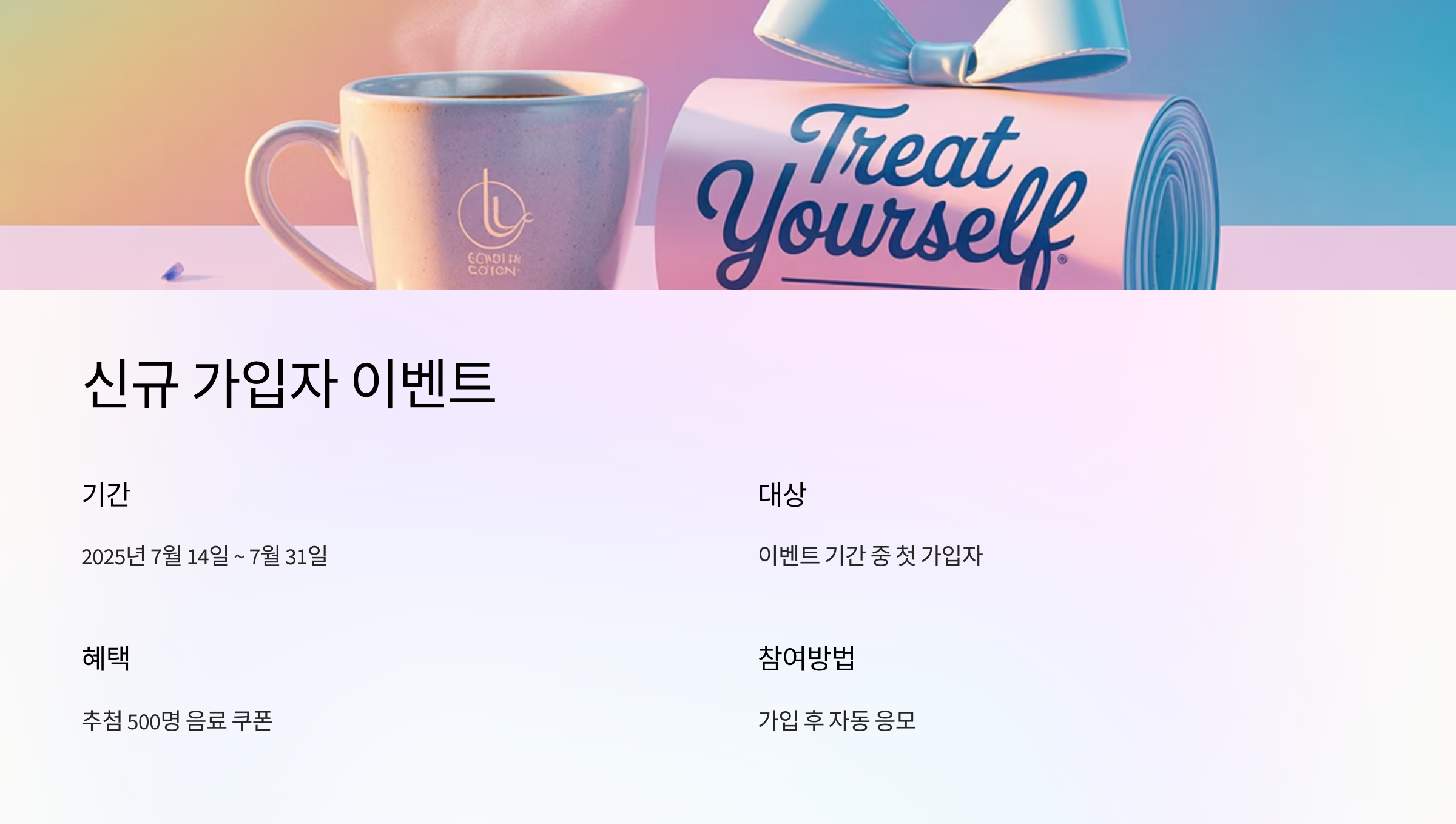 | 이벤트 | 신규 가입자 500명 음료 쿠폰 증정 (7.14~7.31) |