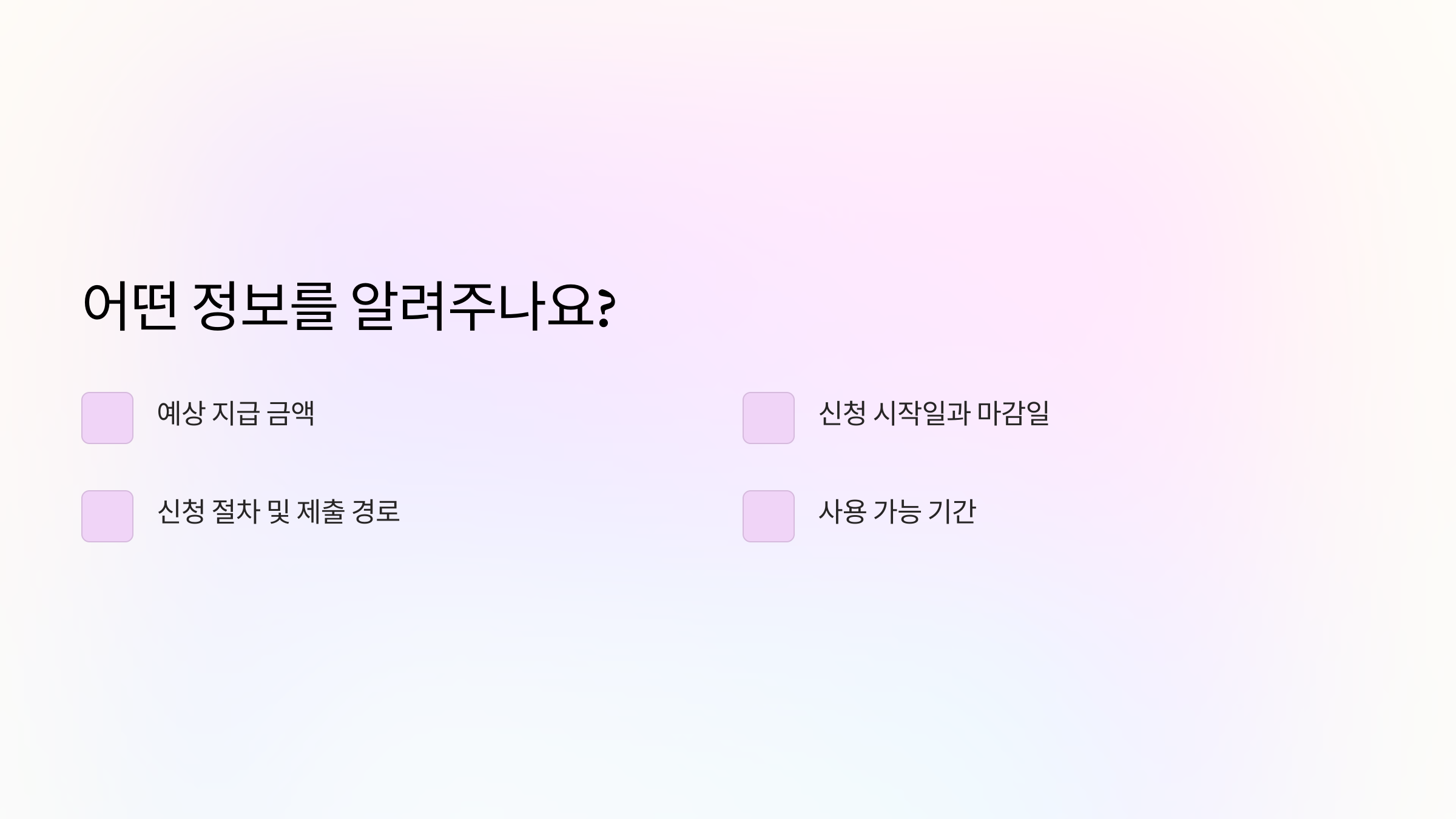 | 주요 정보 | 지급금액, 신청방법, 사용기한, 이의신청 결과 |
