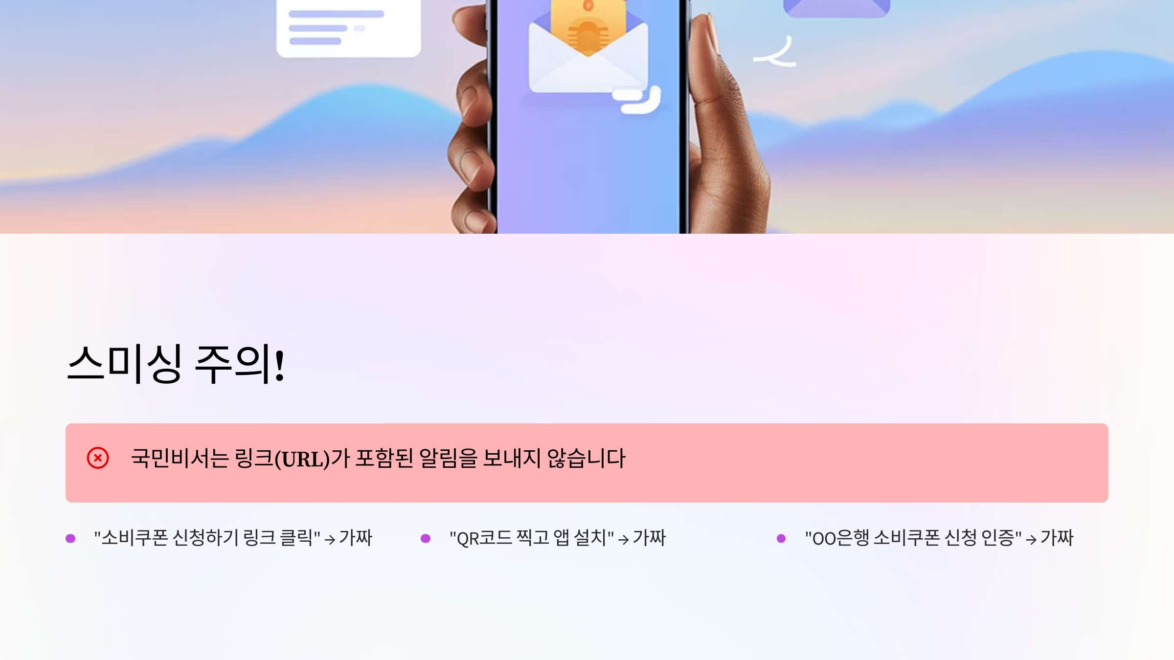| 스미싱 주의 | 링크/QR 포함 문자는 무조건 삭제 |