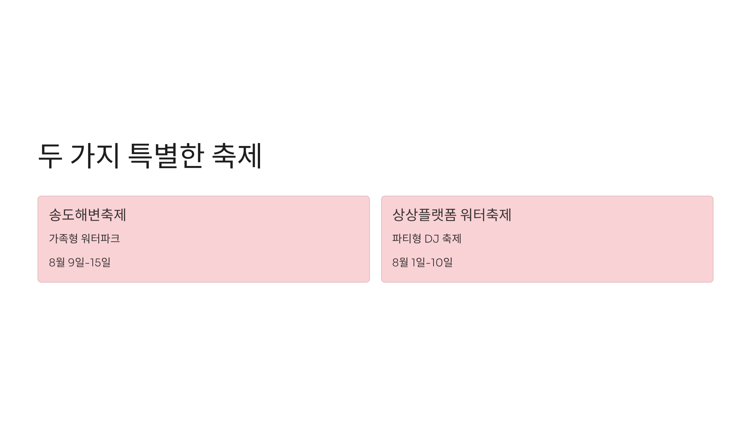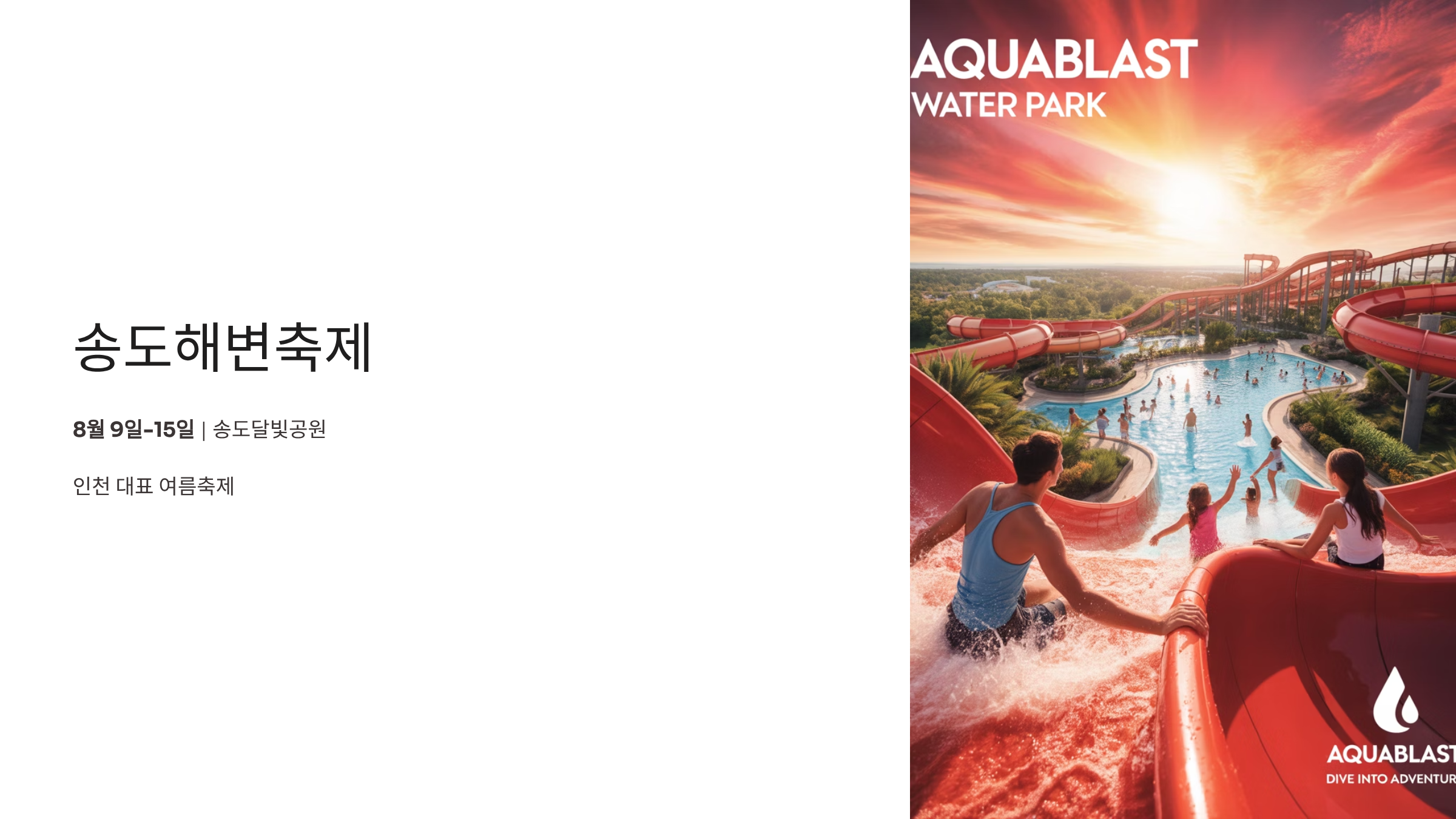인천의 대표 여름축제인 송도해변축제는 매년 수많은 방문객이 찾는 워터축제입니다. 송도달빛공원 일대를 해변과 물놀이 공간으로 꾸며 아이부터 어른까지 모두 즐길 수 있는 공간을 제공합니다.