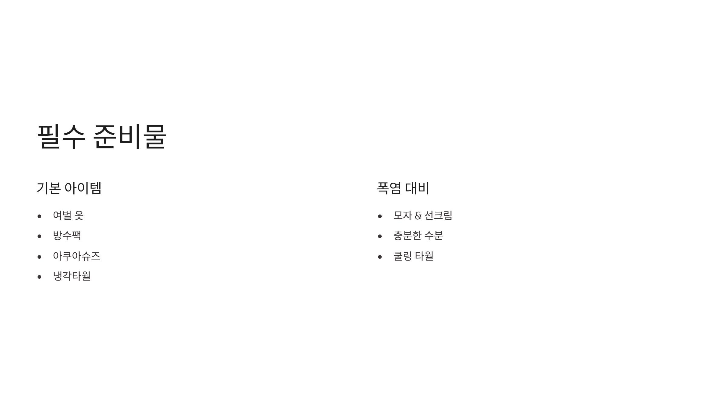 - 여벌 옷, 방수팩, 아쿠아슈즈, 냉각타월, 모자, 선크림은 필수입니다.