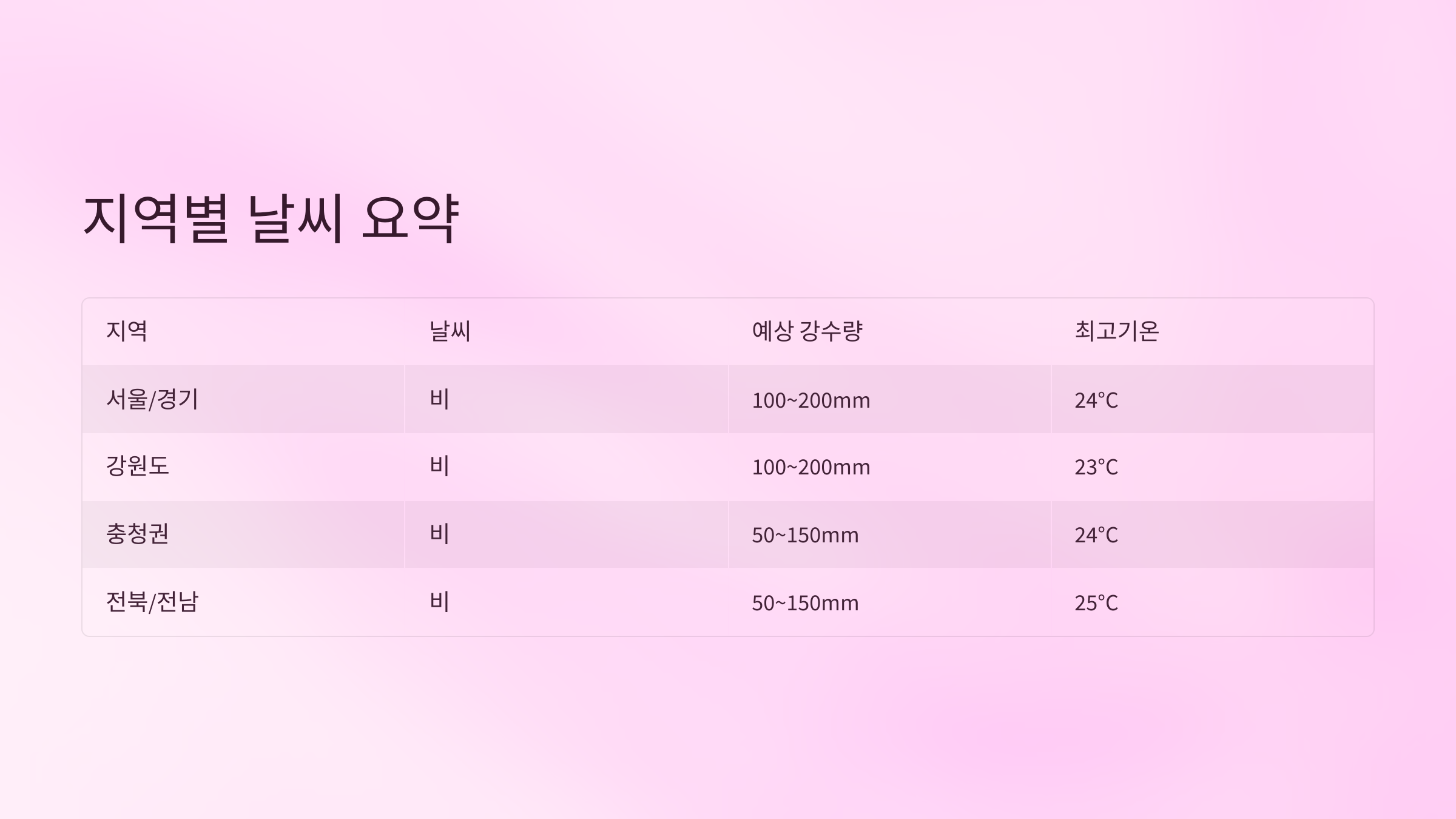 | 지역 | 날씨 | 예상 강수량 | 최고기온 |