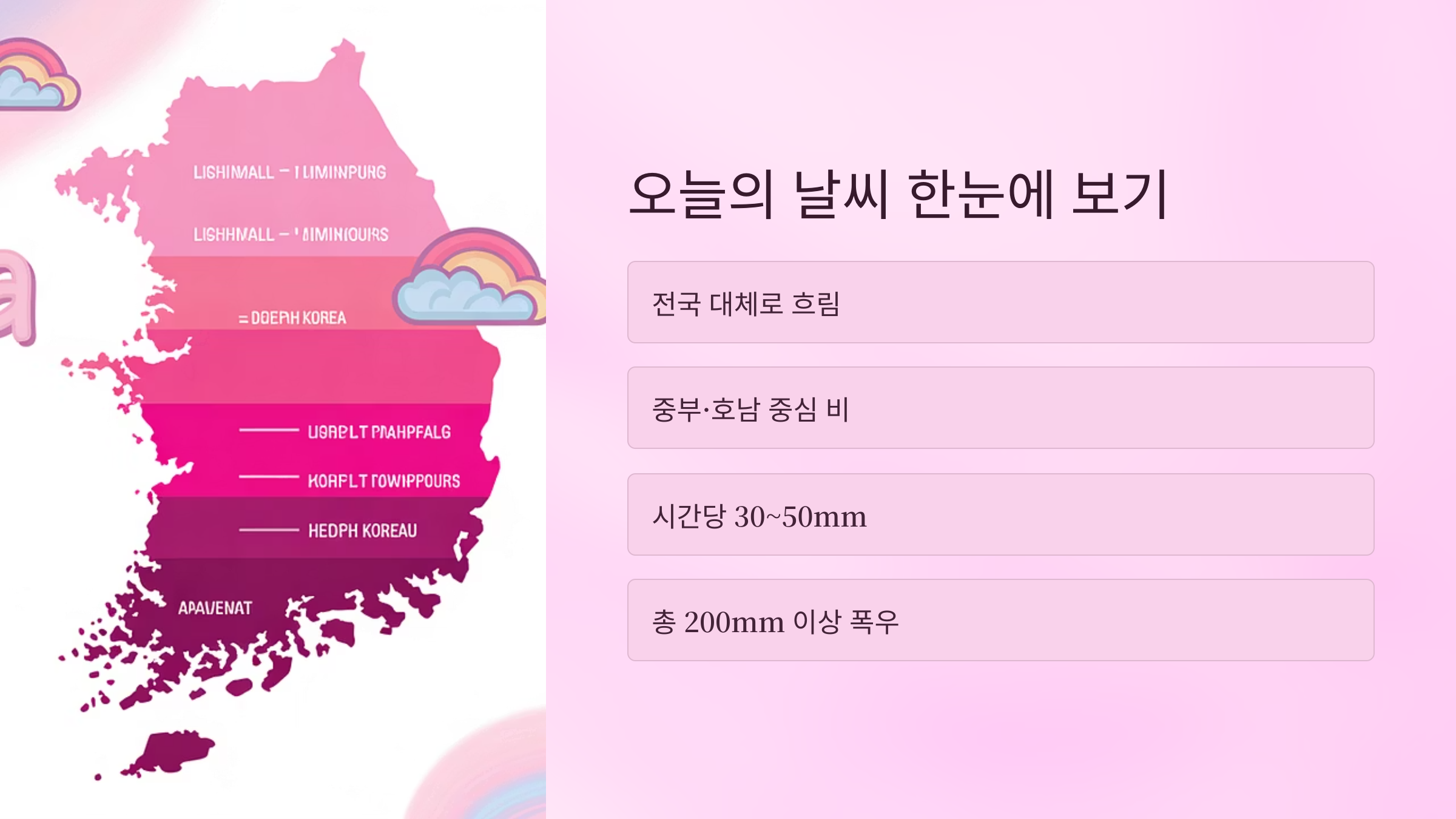 | 서울/경기 | 비 | 100~200mm | 24°C |