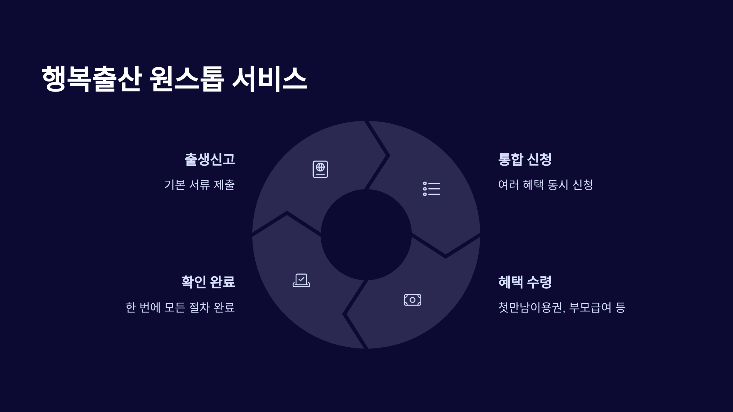 출산 후, 다양한 혜택을 일일이 신청하는 것이 번거롭다면 ‘행복출산 원스톱 서비스’를 활용해보세요.