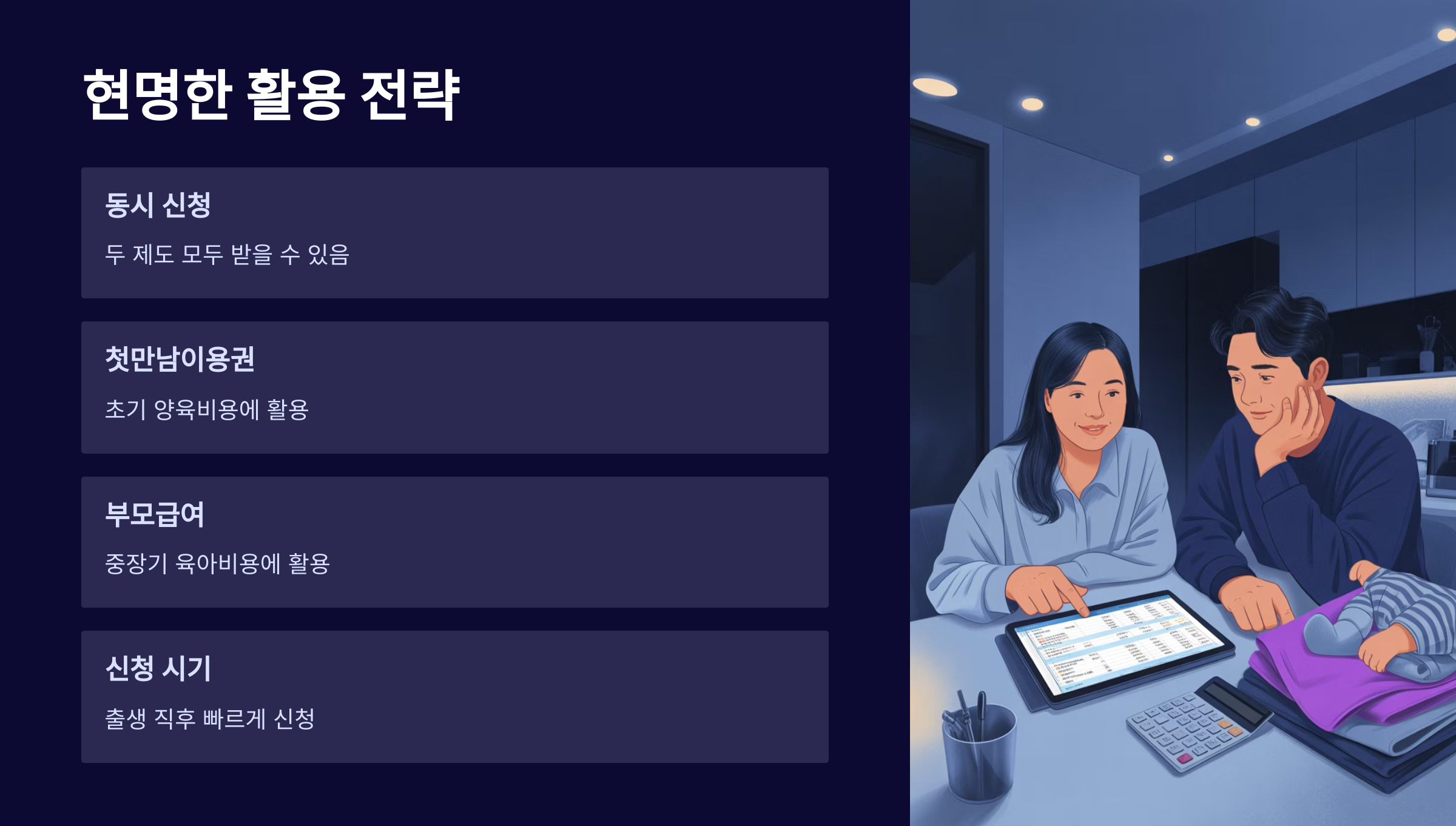 부모급여는 매달 지급되므로 중장기적인 육아비용에 큰 도움이 되며, 장기간 수령을 원한다면 생후 60일 이내 신청을 권장합니다.