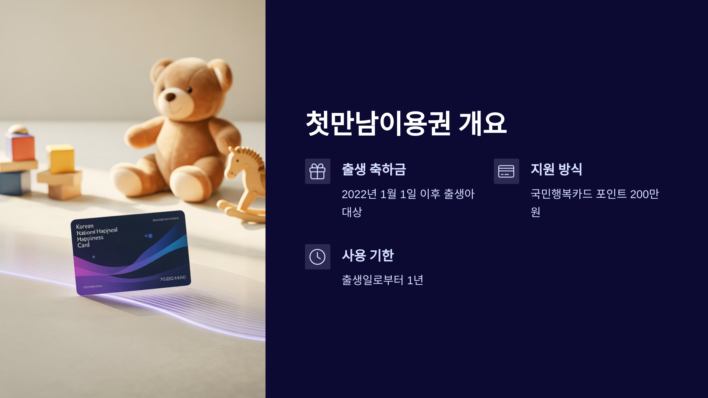 2022년 1월 1일 이후 출생한 모든 아동에게 지급되는 첫 만남 이용권은 아이가 태어난 것을 축하하고, 초기 양육비 부담을 덜기 위한 정부 지원 제도입니다.