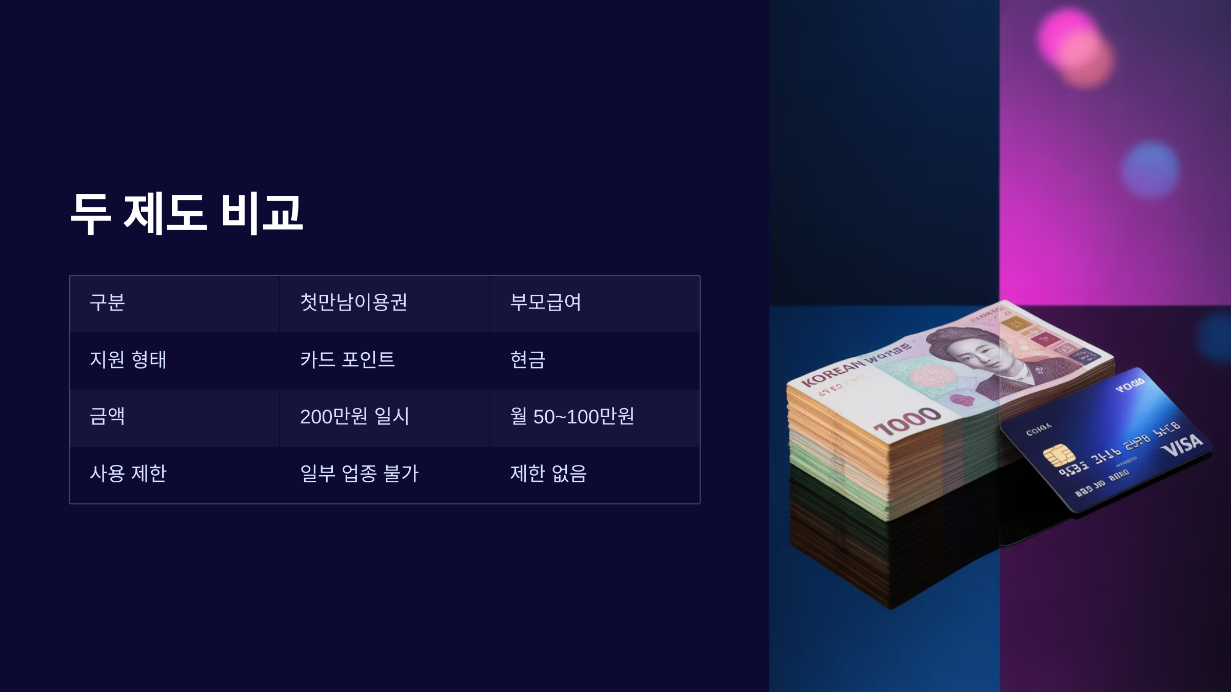 | 지원 형태 | 국민행복카드 포인트 (200만 원 일시 지급) | 현금 (월 30만~100만 원 정기 지급) |