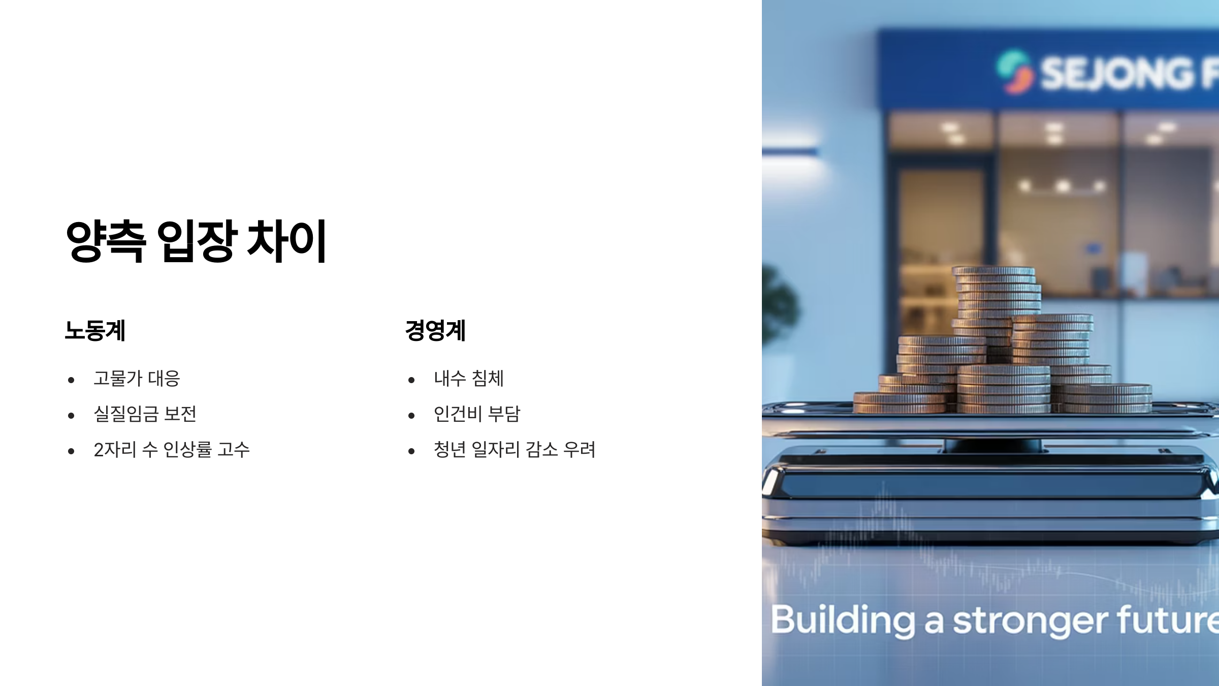 반면, 경영계는 내수 침체, 인건비 부담 증가, 청년 아르바이트 축소 등을 이유로 최소한의 인상만을 주장하고 있습니다.