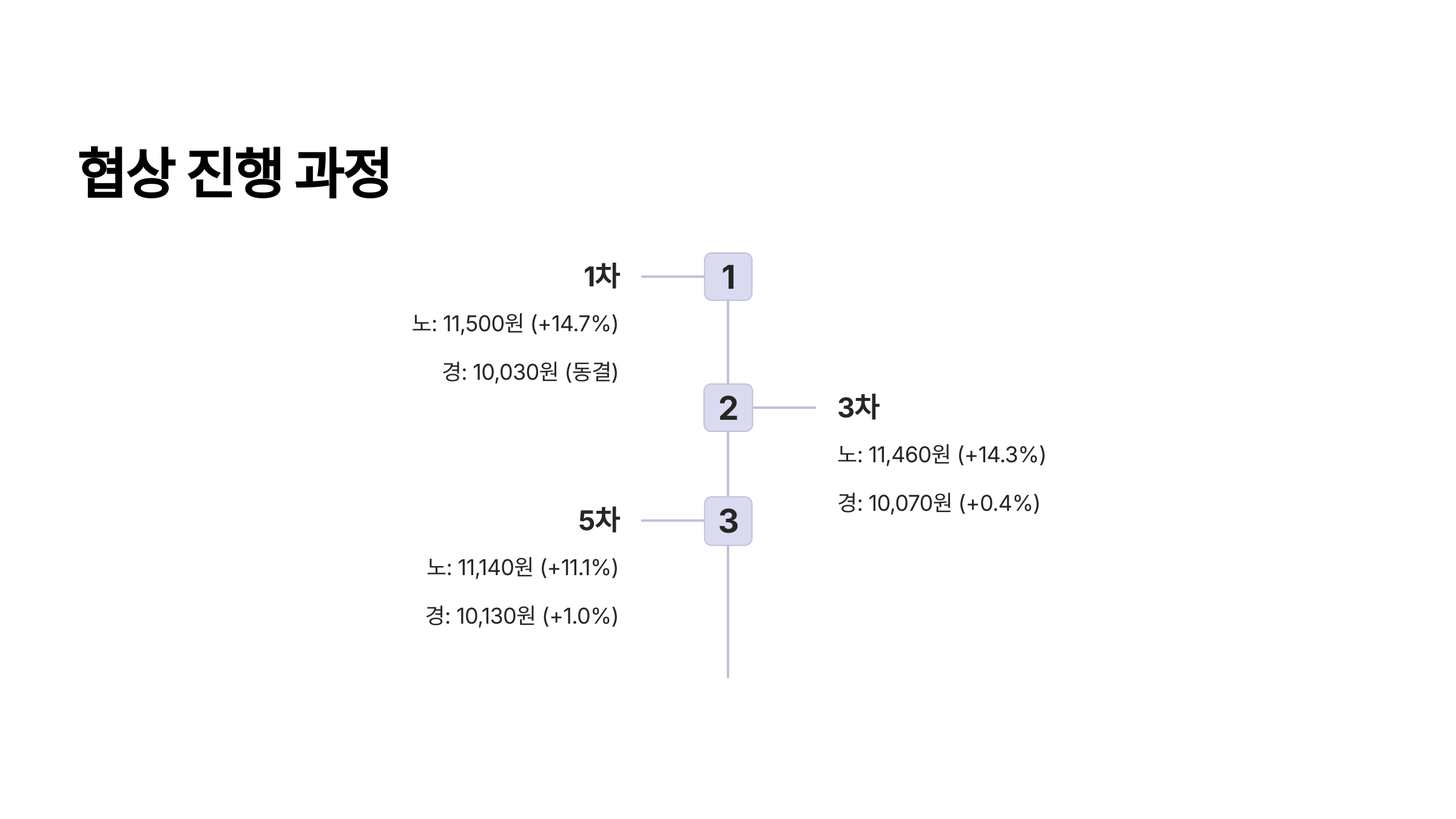 | 단계 | 노동계 요구안 | 인상률 | 경영계 요구안 | 인상률 |