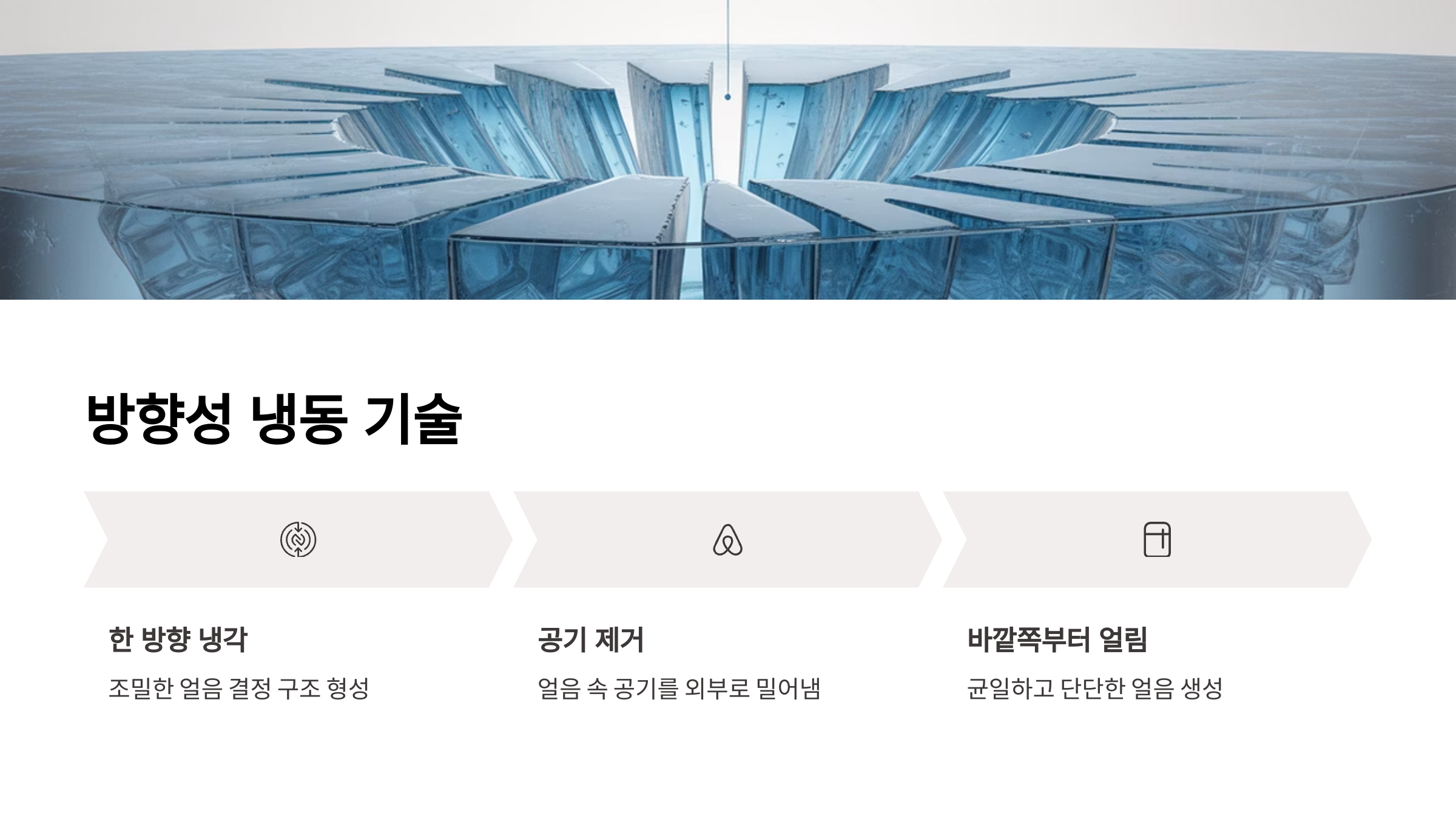 이러한 방식은 얼음 속 공기를 외부로 밀어내고, 중앙이 아닌 바깥쪽부터 얼게 하여 균일하고 단단한 얼음을 만들게 됩니다.