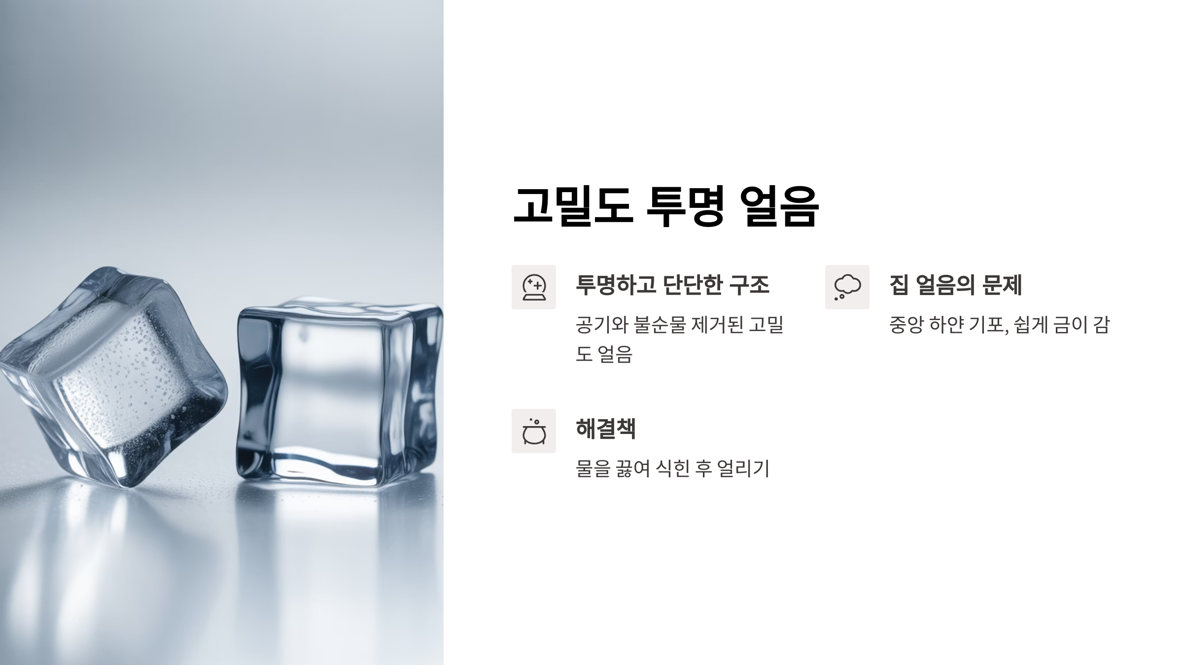 ✅ 팁: 집에서도 물을 한 번 끓여 식힌 후 얼리면 투명 얼음 만들기 가능!