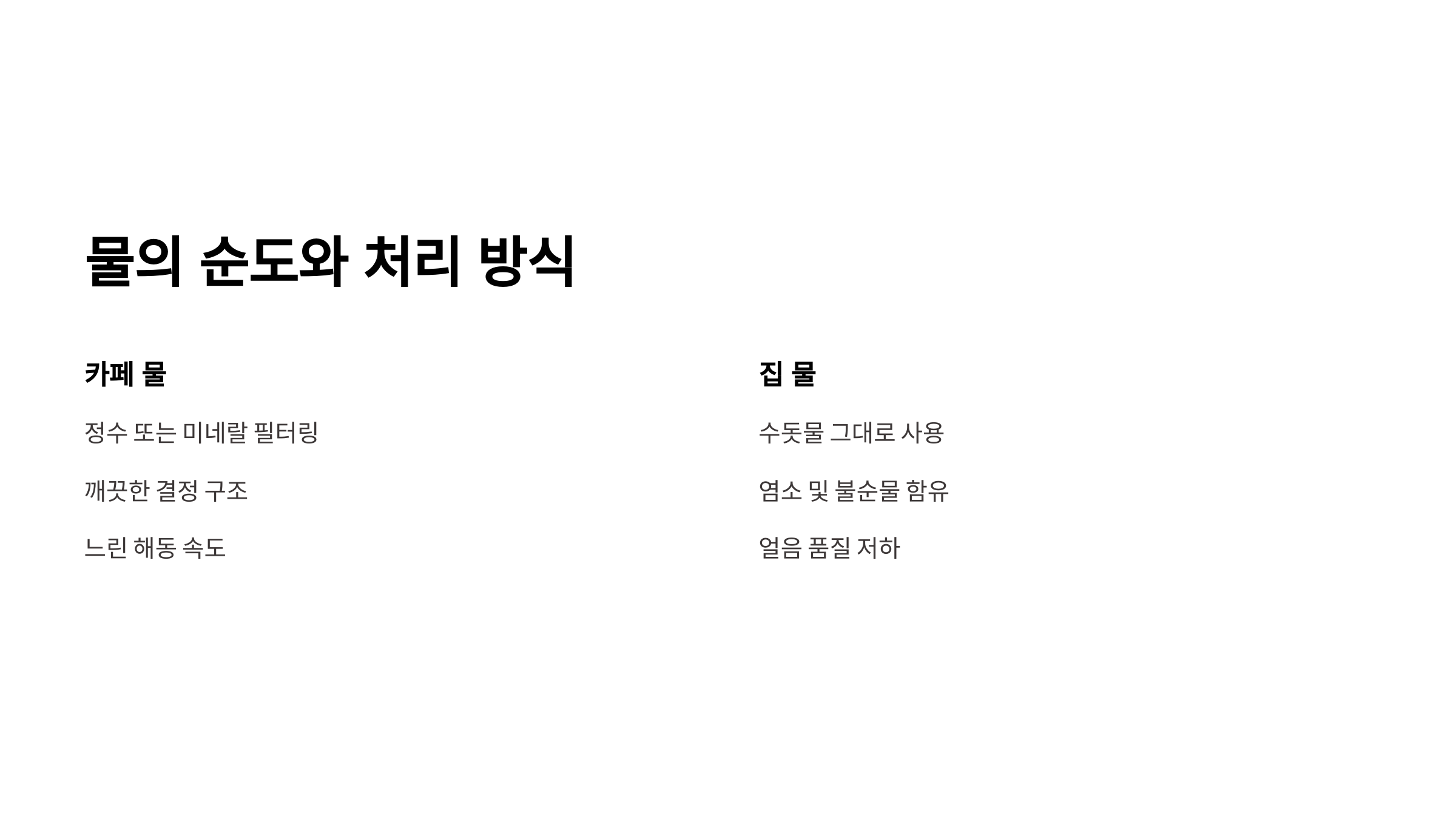 카페는 정수된 물이나 미네랄 필터링 된 물을 사용해 얼음을 만듭니다. 반면, 집에서는 수돗물을 그대로 사용하는 경우가 많은데, 이 경우 염소나 기타 불순물이 얼음의 품질을 떨어뜨리게 됩니다.
