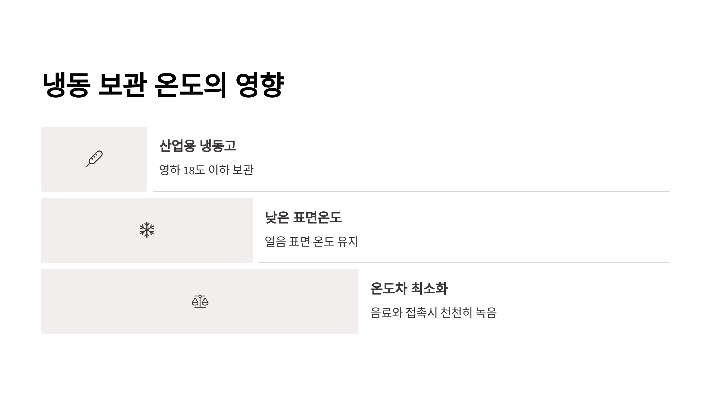 카페에서는 영하 18도 이하의 산업용 냉동고에서 얼음을 보관해 얼음의 표면온도를 낮춥니다. 이렇게 저장된 얼음은 컵에 담겨 음료와 접촉했을 때 온도차가 크지 않아 천천히 녹습니다.