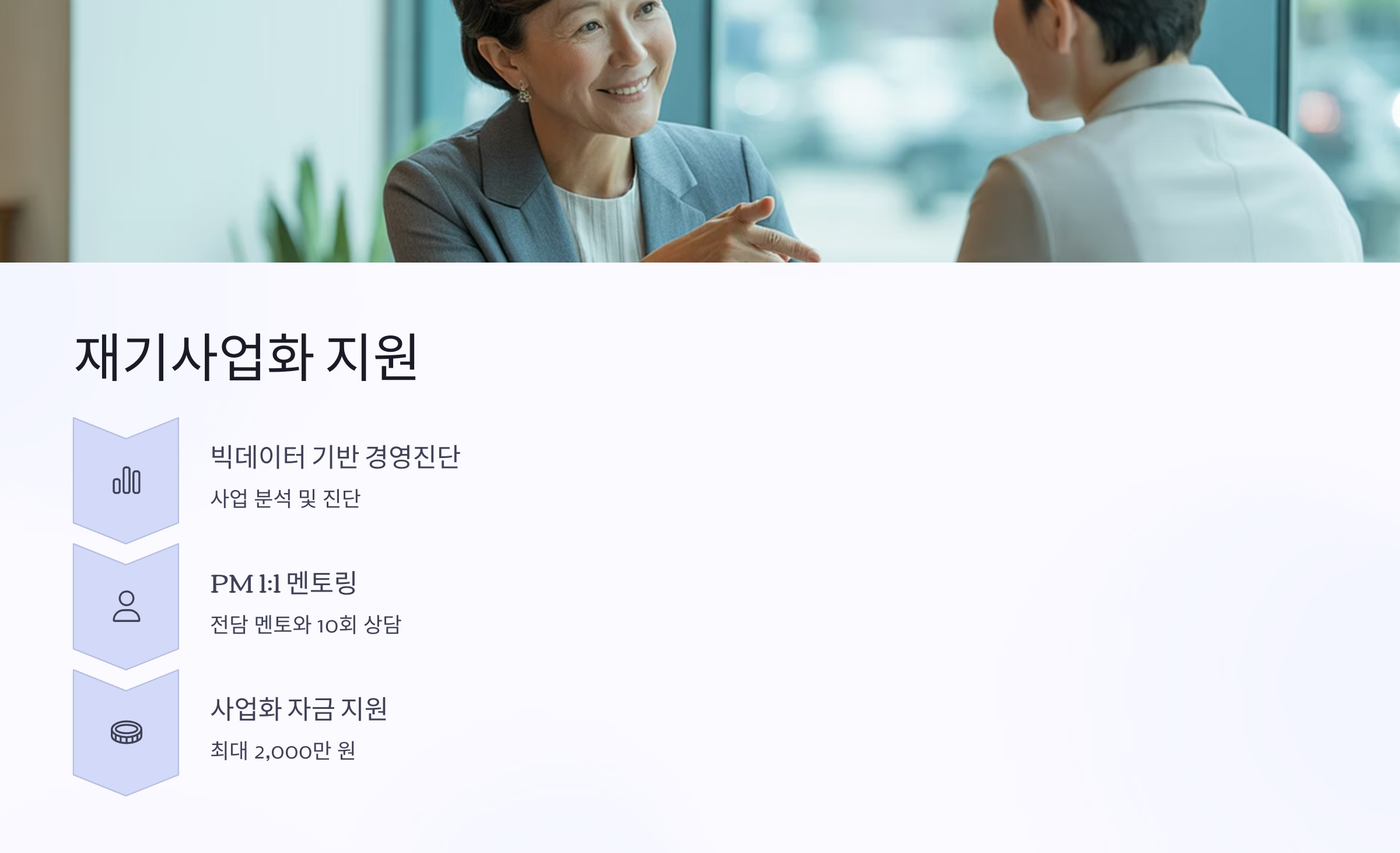 폐업 후에도 다시 일어설 수 있습니다. 이번에는 기존보다 더 정교한 진단과 밀착 멘토링이 함께합니다.
