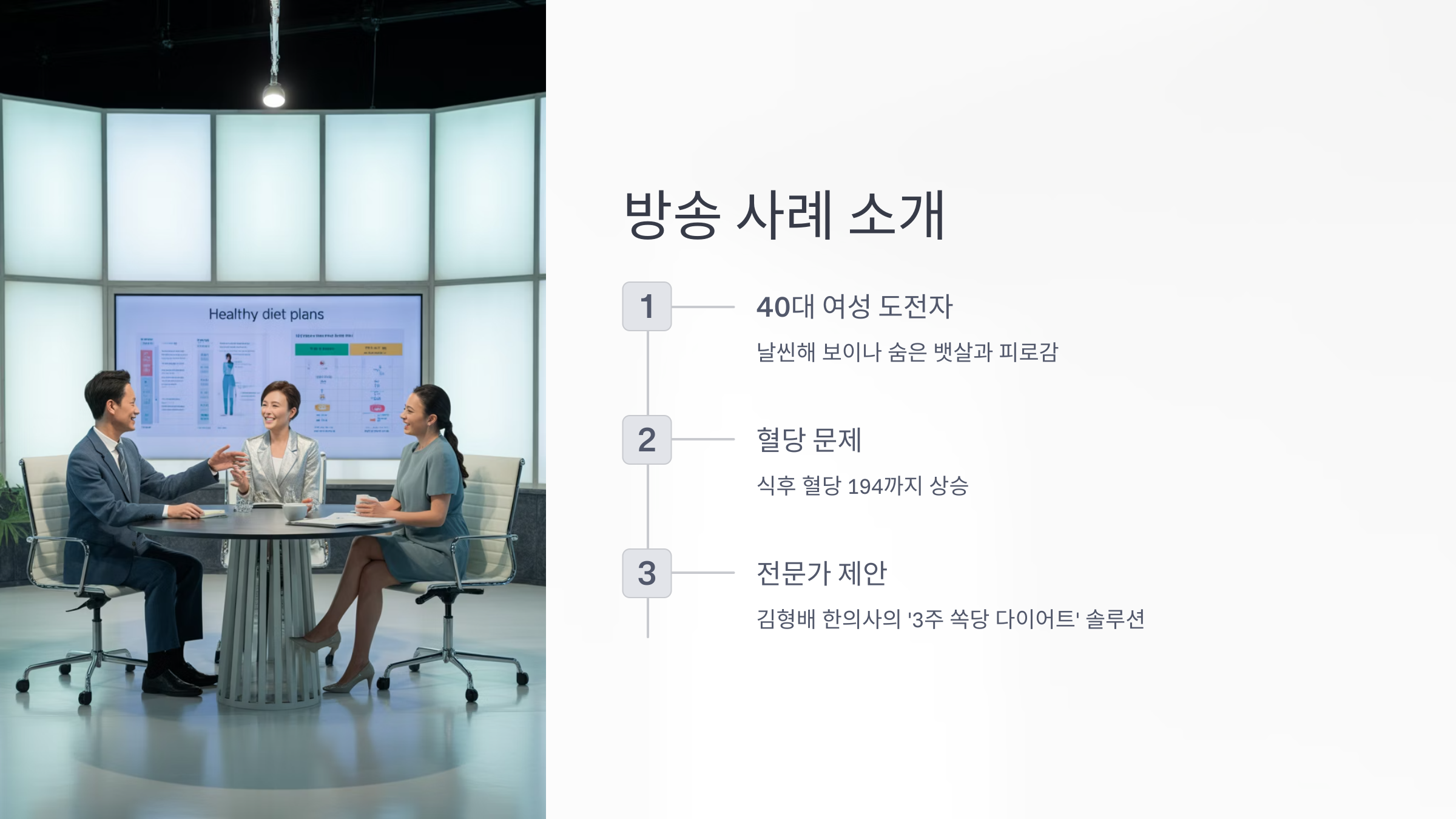 요즘 혈당이 오르거나 쉽게 살이 찌는 체질로 고민하신다면 주목하세요! 2025년 5월 20일 방송된 채널A '몸신의 탄생'에서 획기적인 다이어트 솔루션이 공개됐습니다. 이름하여 ‘3주 쏙당 다이어트’, 혈당 스파이크를 막고 뱃살까지 효과적으로 관리할 수 있는 건강한 다이어트 방식입니다.