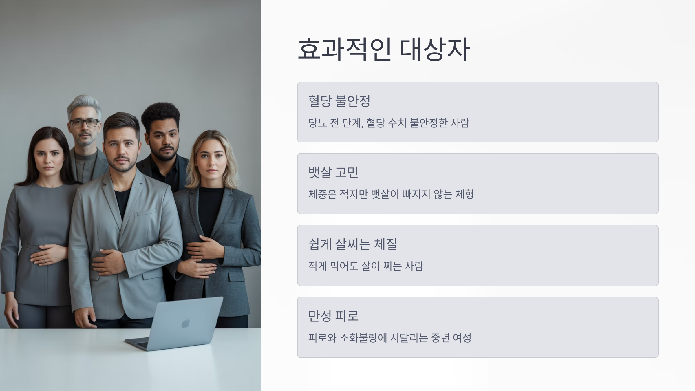 특히 겉보기에는 마른 체형이지만 뱃살이 빠지지 않는 중년 여성, 그리고 만성 피로와 체중 증가로 고민하는 직장인에게 강력 추천합니다!