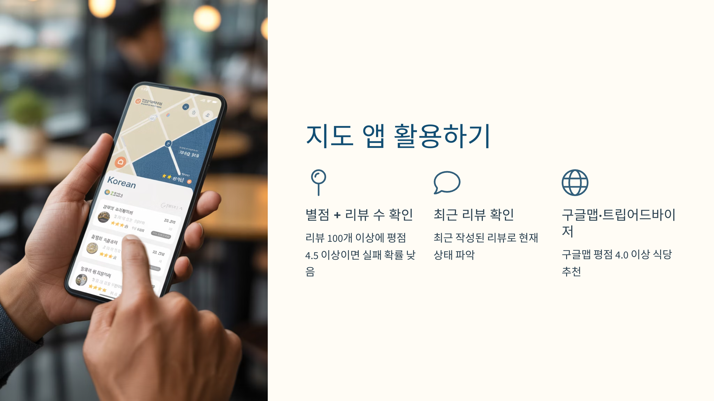 외국인 관광객이 많은 지역에서는 구글맵 평점 4.0 이상 식당도 좋은 선택입니다.