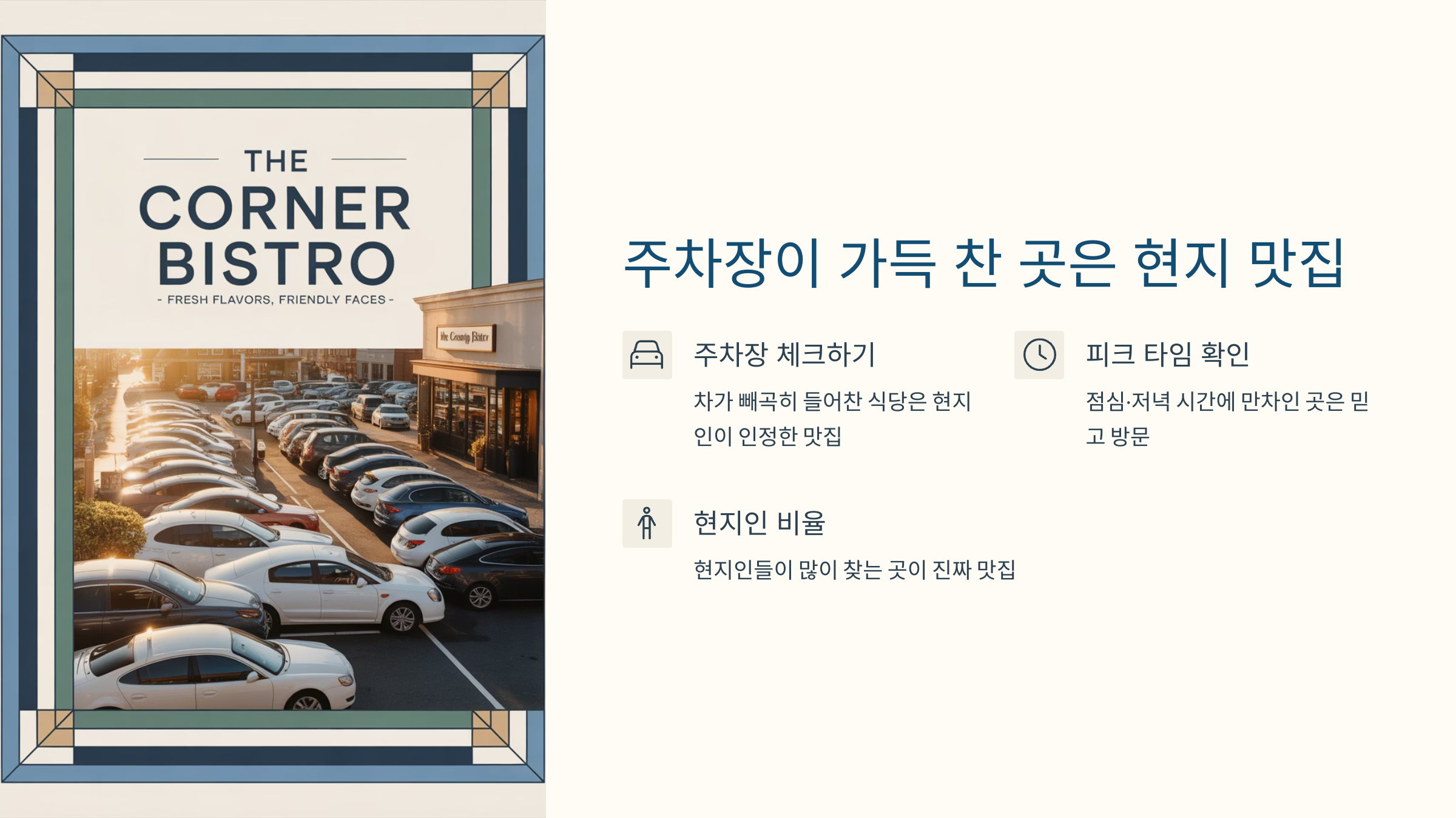 현지인들은 정말 맛있는 집만 꾸준히 찾기 때문에, 주차장이 북적이는 곳은 그 지역 주민이 인정한 맛집일 가능성이 큽니다.