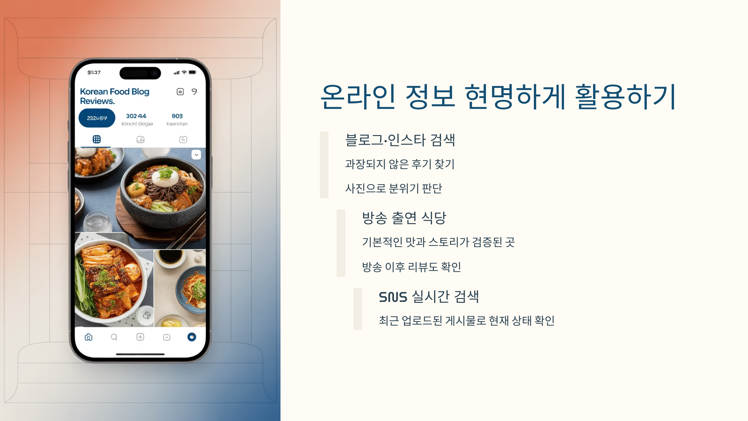 인스타그램도 ‘#○○한식’, ‘#○○밥집’처럼 검색하면 진짜 이용자 후기를 찾기 쉬워요.