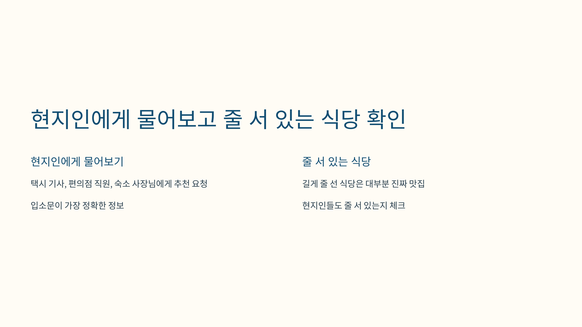 택시 기사님, 편의점 직원, 카페 바리스타, 숙소 사장님 등 그 지역에서 살아가는 사람들에게 직접 “여기서 진짜 맛있는 집 어디예요?”라고 물어보세요.