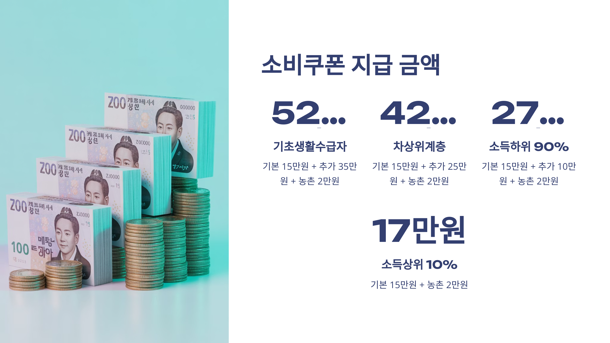 | 기초생활수급자 | 15만 원 | +35만 원 | +2만 원 | 52만 원 |