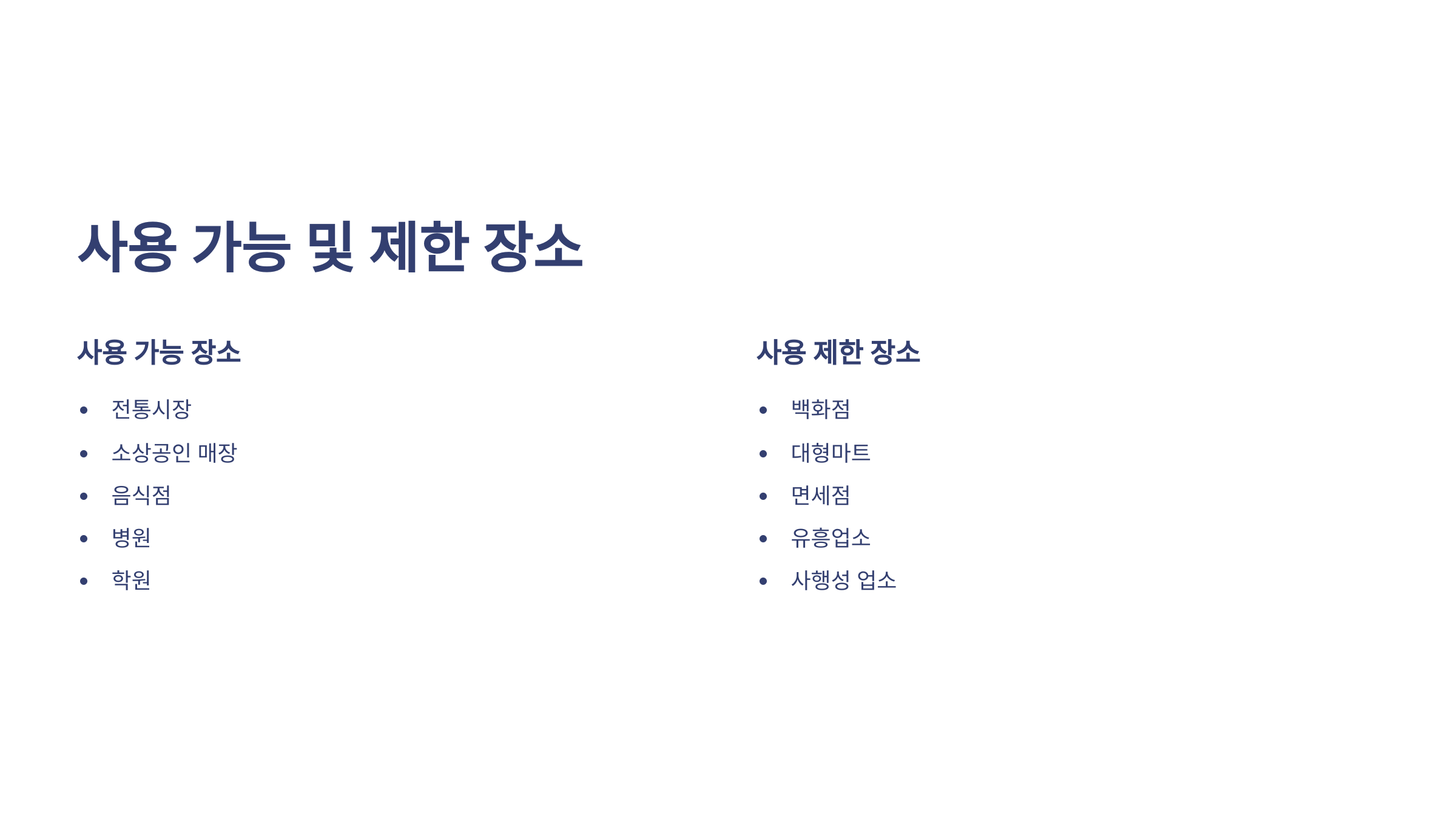 사용처는 전통시장, 소상공인 매장, 음식점, 병원, 학원 등 대부분의 생활시설에서 가능하며, 다음과 같은 곳에서는 사용이 제한됩니다:
