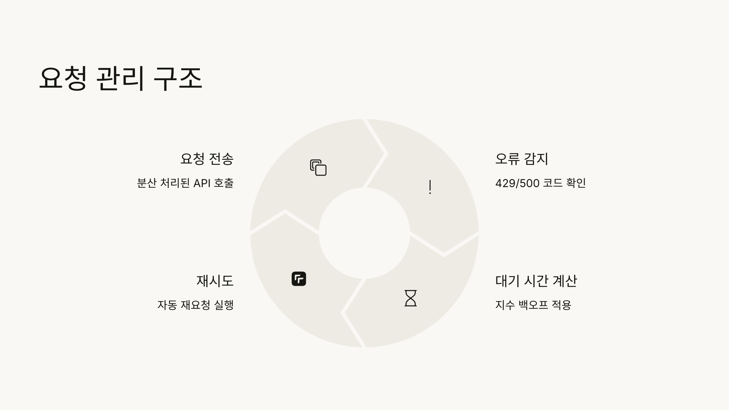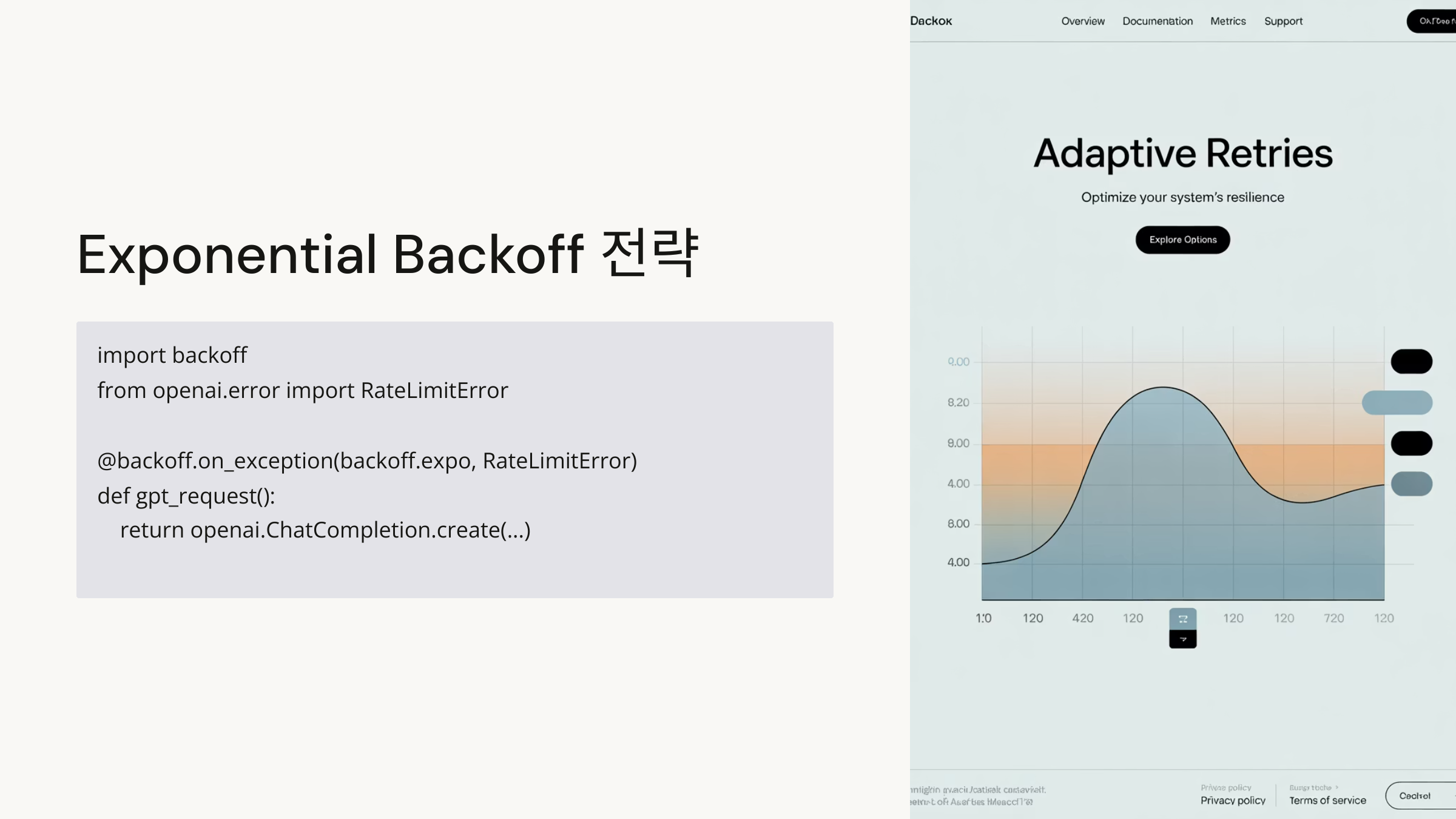 - Exponential Backoff 적용: 요청 실패 시 점진적으로 대기 시간을 늘리며 재시도
