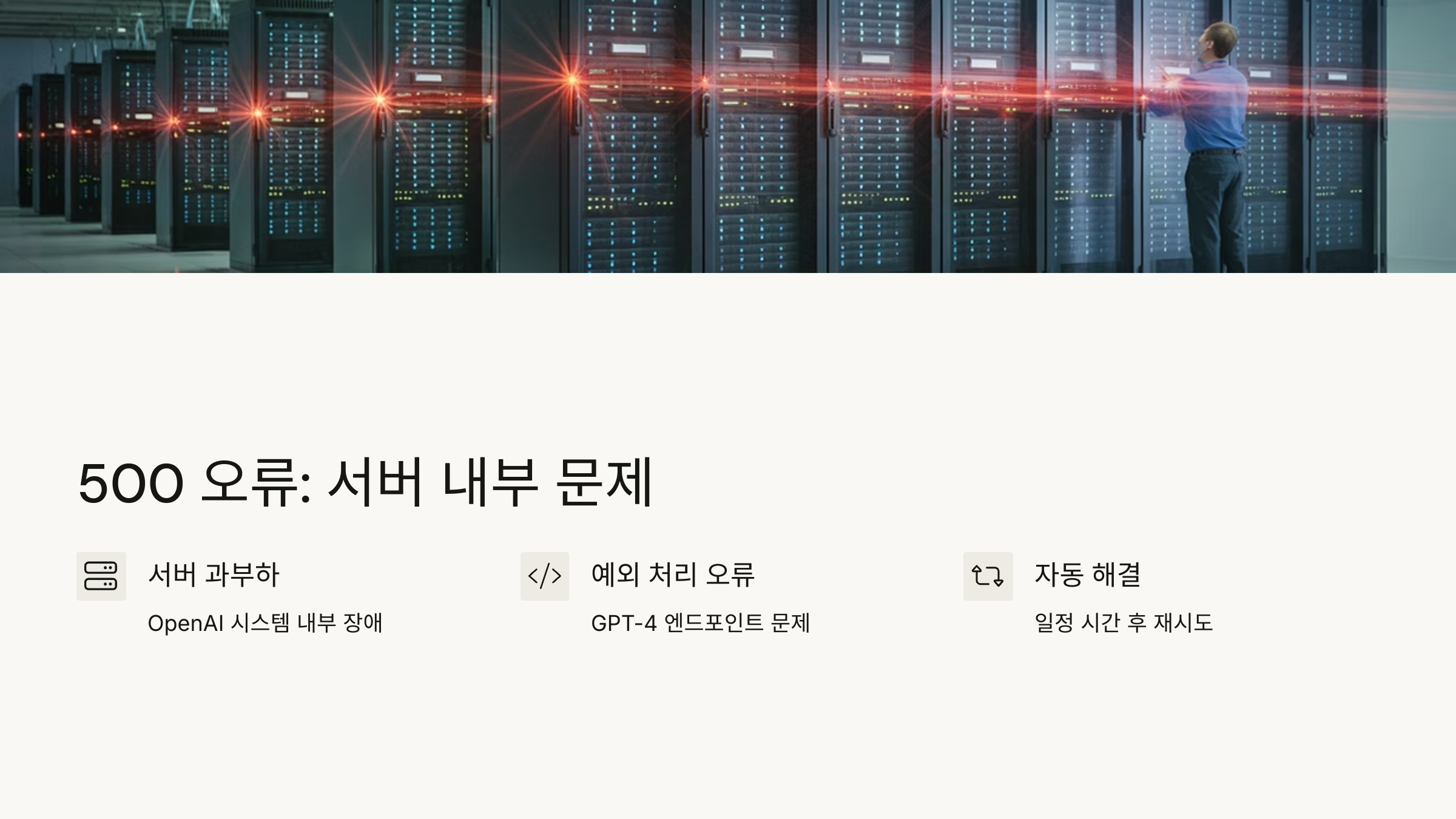 500 오류는 OpenAI 서버에서 발생한 내부 문제로 인해 응답을 정상적으로 처리하지 못할 때 나타납니다. 클라이언트의 잘못이 아닌 서버 측 문제이며, 일정 시간 후 자동 해결되는 경우가 많습니다.